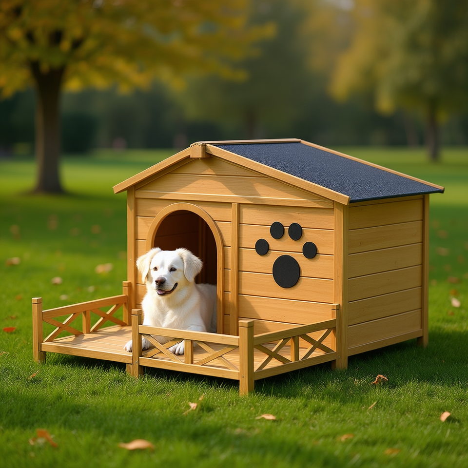 Cuccia per Cani in Legno 48 Pollici con Tetto in Asfalto Resistente all'Acqua, Taglia Media, Stampa Zampa, Colore Naturale, Cuccia da Interno/Esterno con Veranda