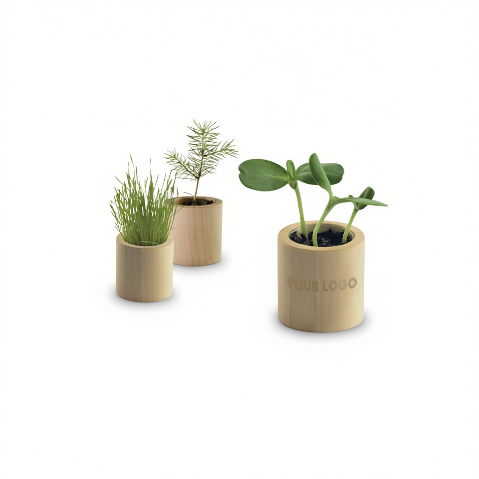 Set Regalo di Vasi Rotondi in Legno con Semi per Piante da Interno