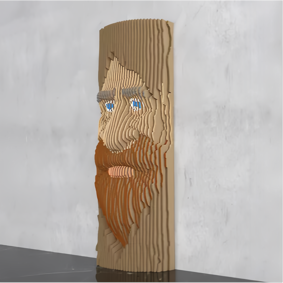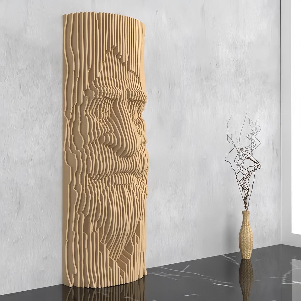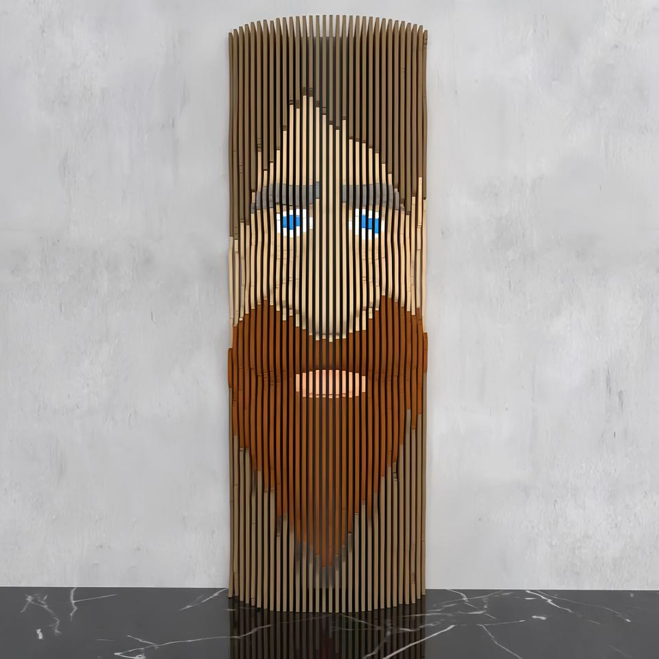 Wooden Portrait Wall Sculpture Vertical Slat Structure Brown Male Face Wood Carving Art Home Decor