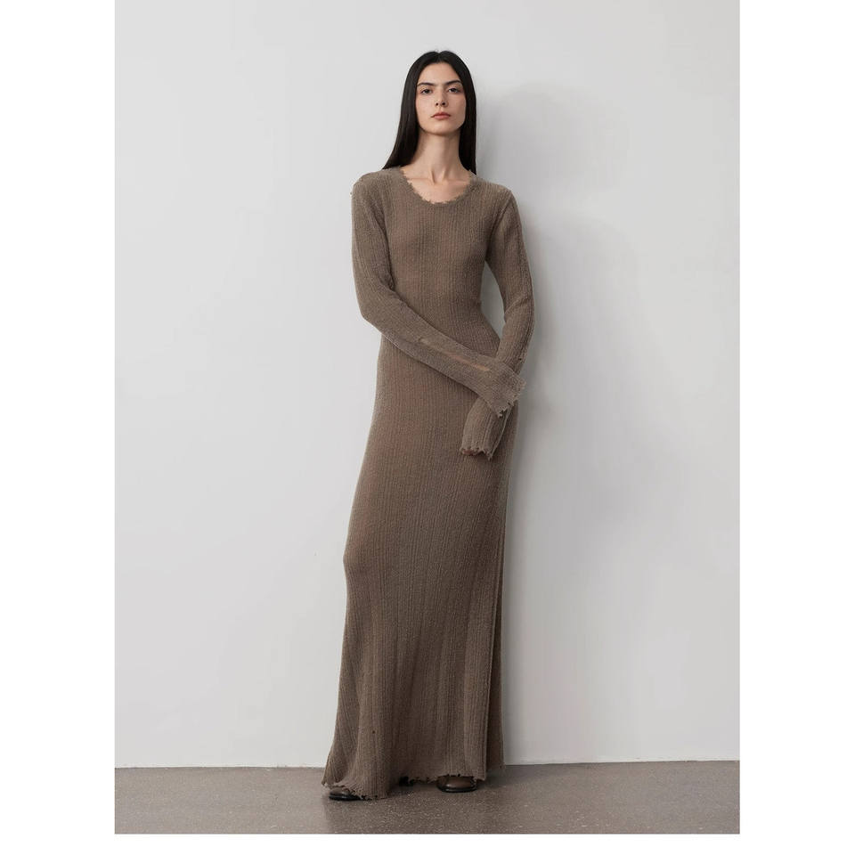 Abito Lungo in Lana con Bordi Grezzi e Effetto Drappeggiato, Vestibilità Slim