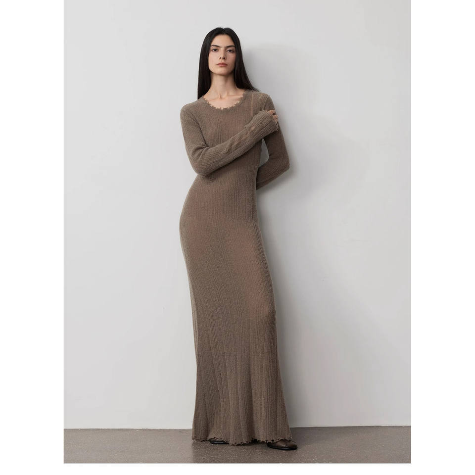 Abito Lungo in Lana con Bordi Grezzi e Effetto Drappeggiato, Vestibilità Slim