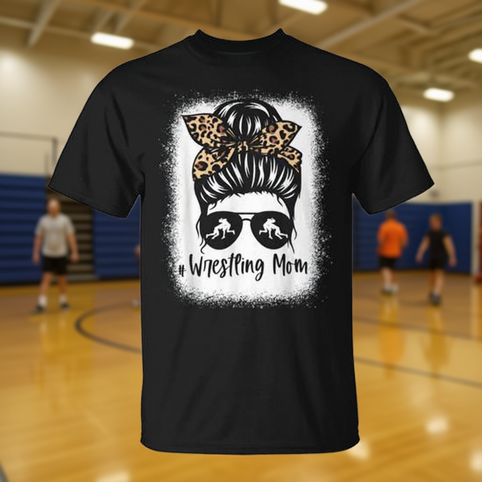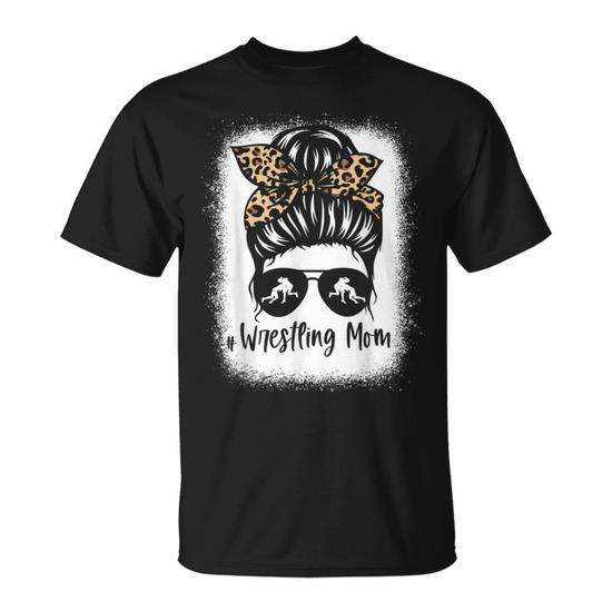 T-shirt con stampa leopardata di Wrestling Mom Messy Bun per i fan del wrestling