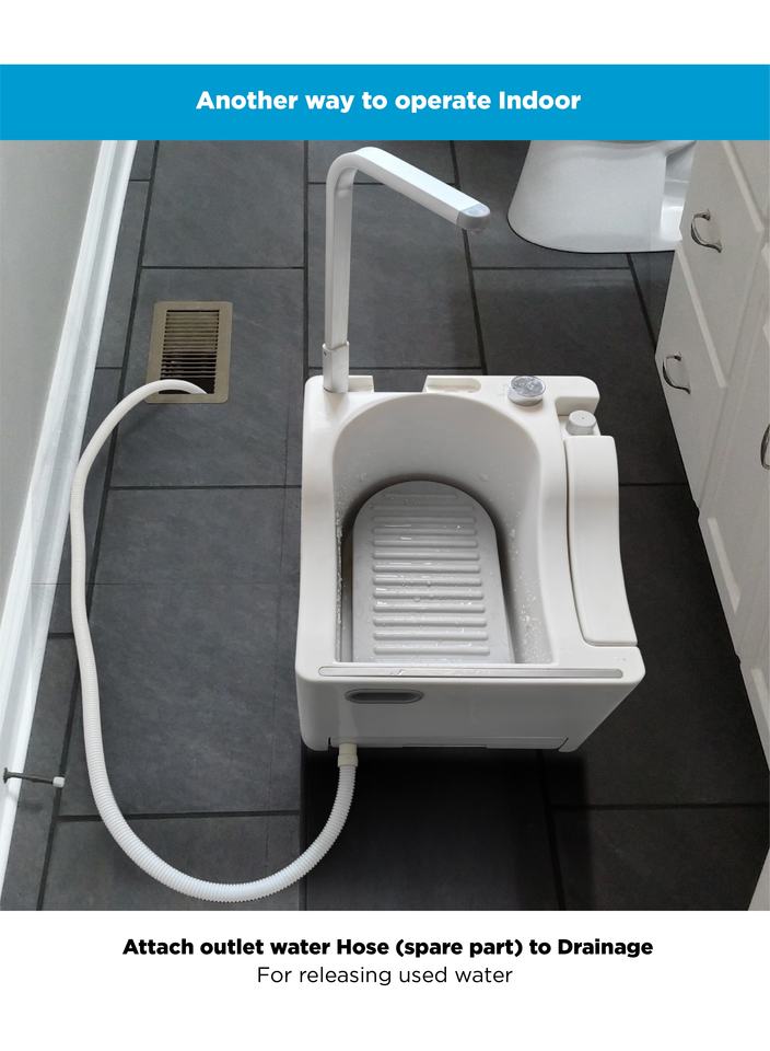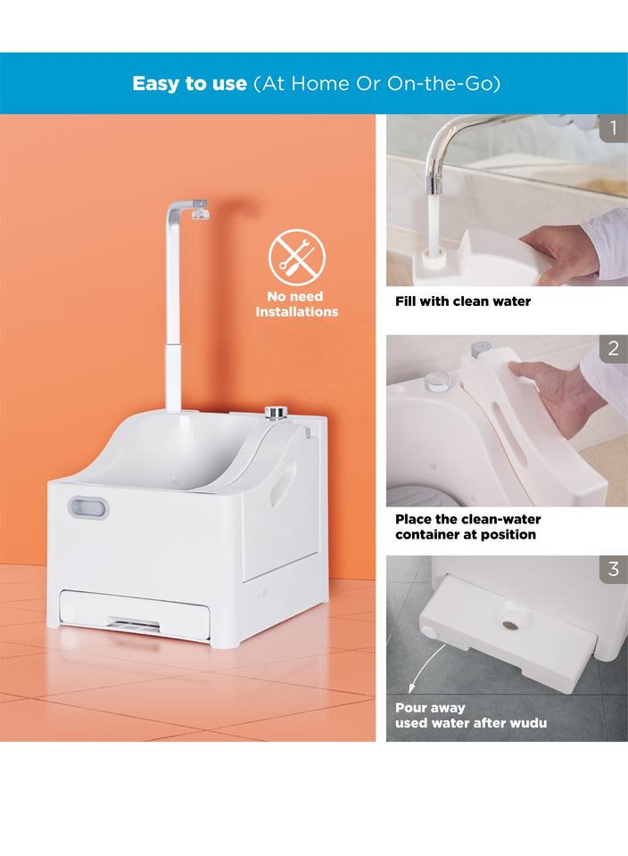Wudu Basin, Wudumate Foot Washer. Shattaf + Hose Accessory. First Portable Wudu Sink with Clean Water Used Water Canisters Both