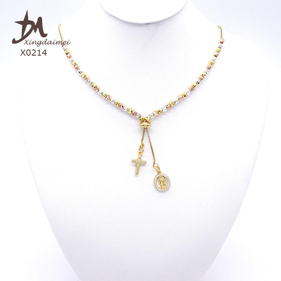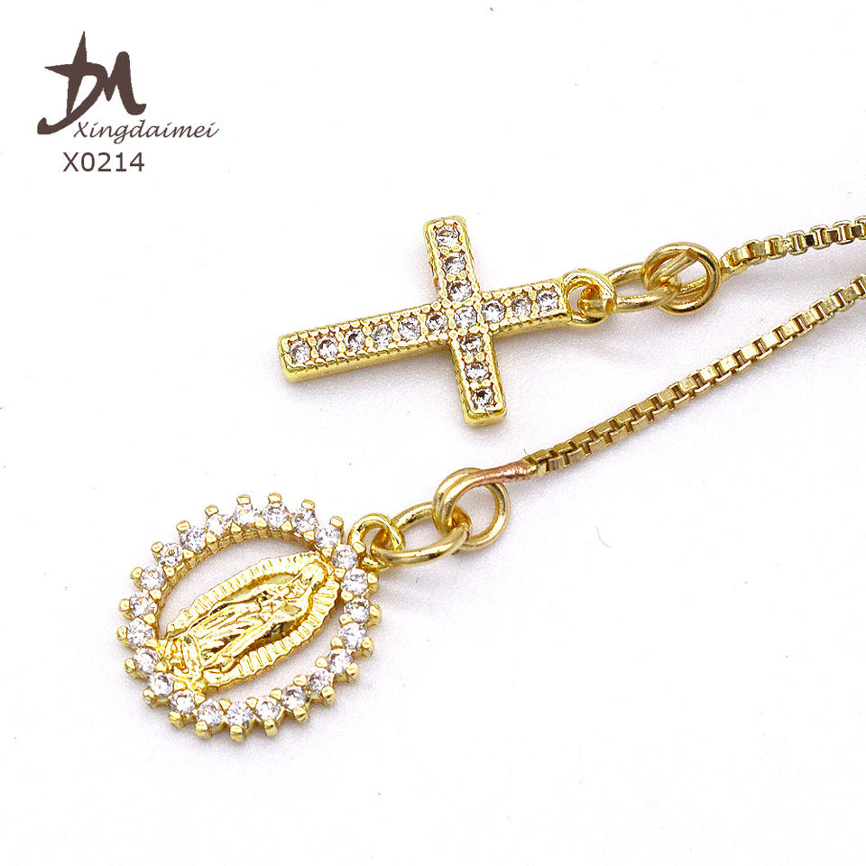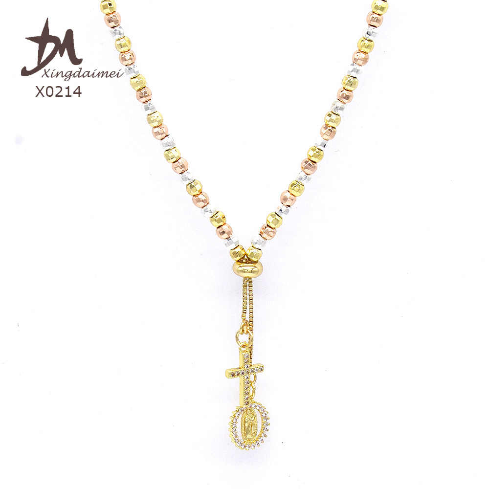 X0214 commercio all'ingrosso ultimo design di lusso 3 colori rosario vergine maria zircone collana collana rosario in legno placcato oro