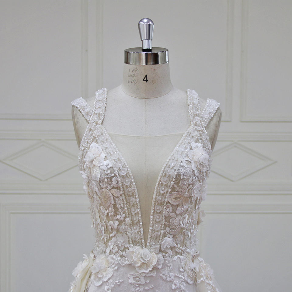 XF17011 Hot Sell Elegant Illusion V Neck Sleeveless Mermaid Dress With Detachable Train 3D Beaded Lace Wedding Gown