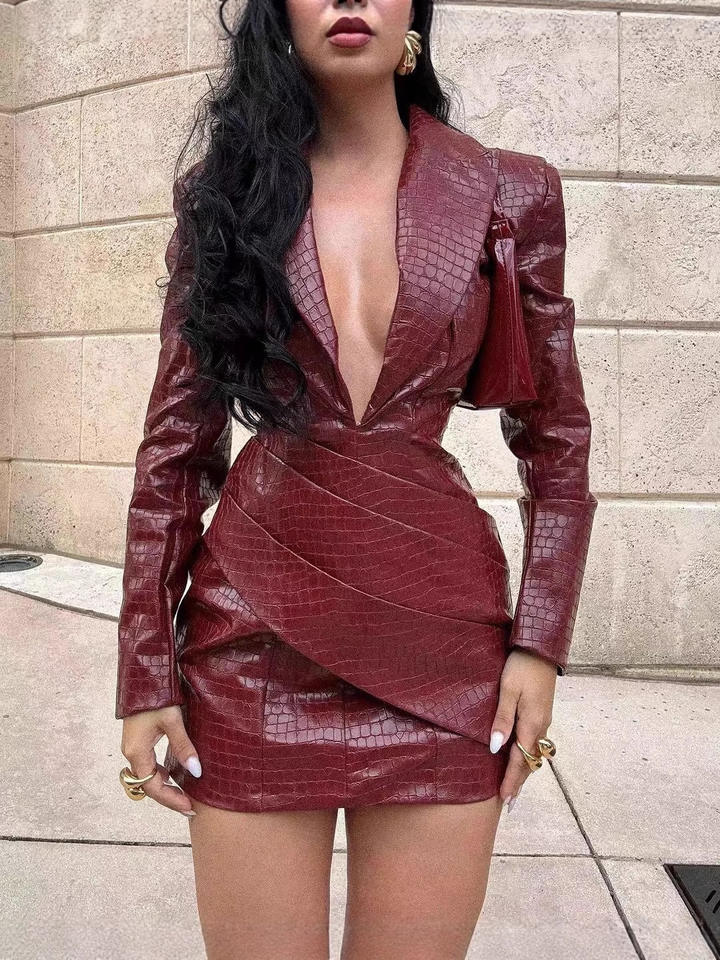 XH1115 - Collezione Autunno 2026 Donna: Abito in Pelle Rosso Sexy con Scollo a V Profondo e Pieghe