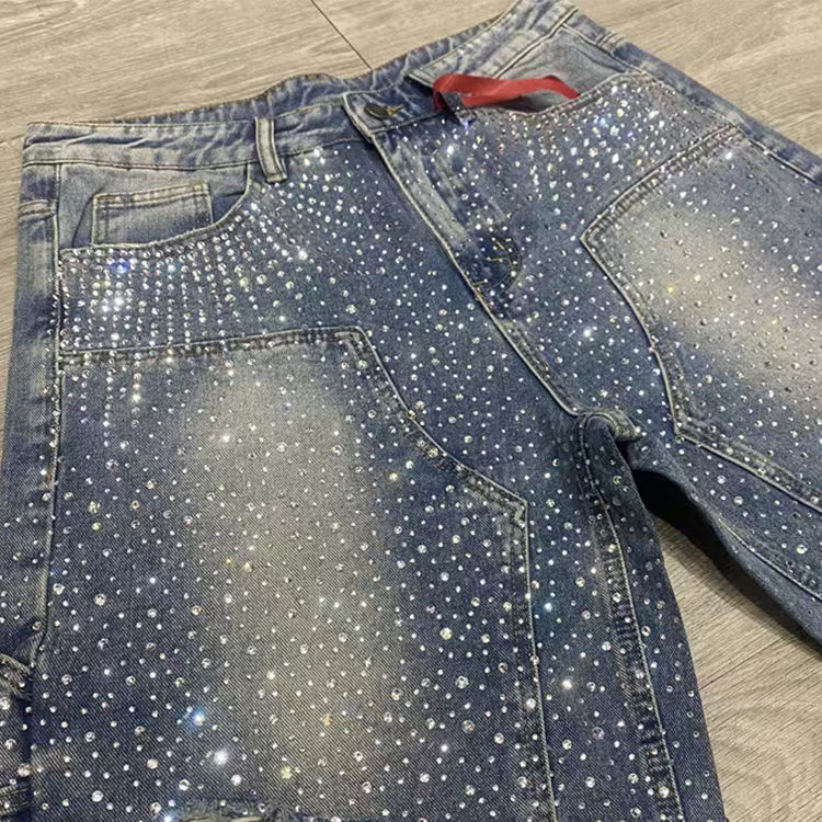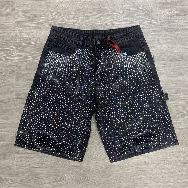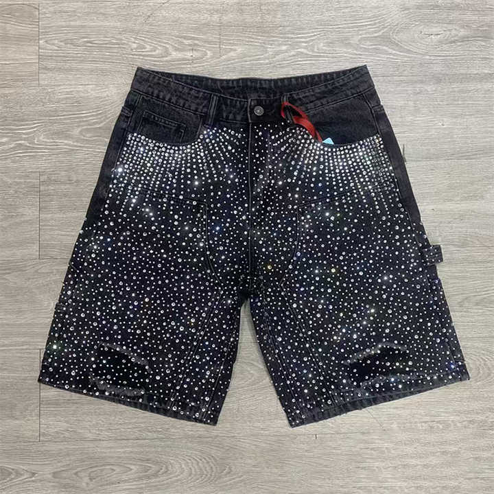 XJYD High Street Custom Men's Distessed Denim Shorts All Over Crystal Acid Wash Rhinestone Baggy Jorts Denim Jeans Shorts