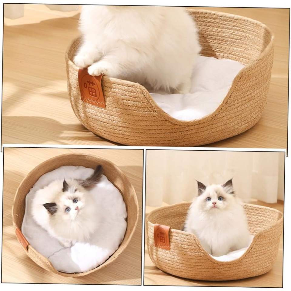Cuccia XL per Cani e Gatti in Rattan Beige, Portatile, Lavabile, Comoda e Resistente, Solo Lavaggio a Mano, con Portaoggetti