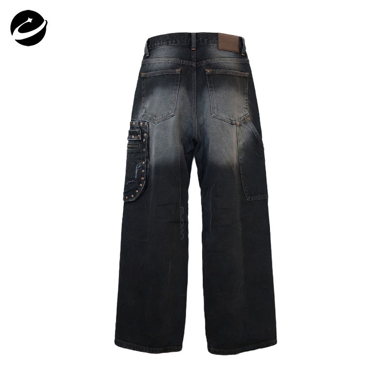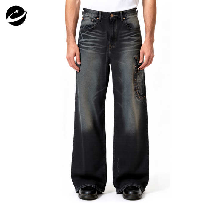 XUCHANG Original Custom Vintage Men's Denim Baggy Black Cargo Rivets Acid Washed Manufacturer Streetwear Jeans Men