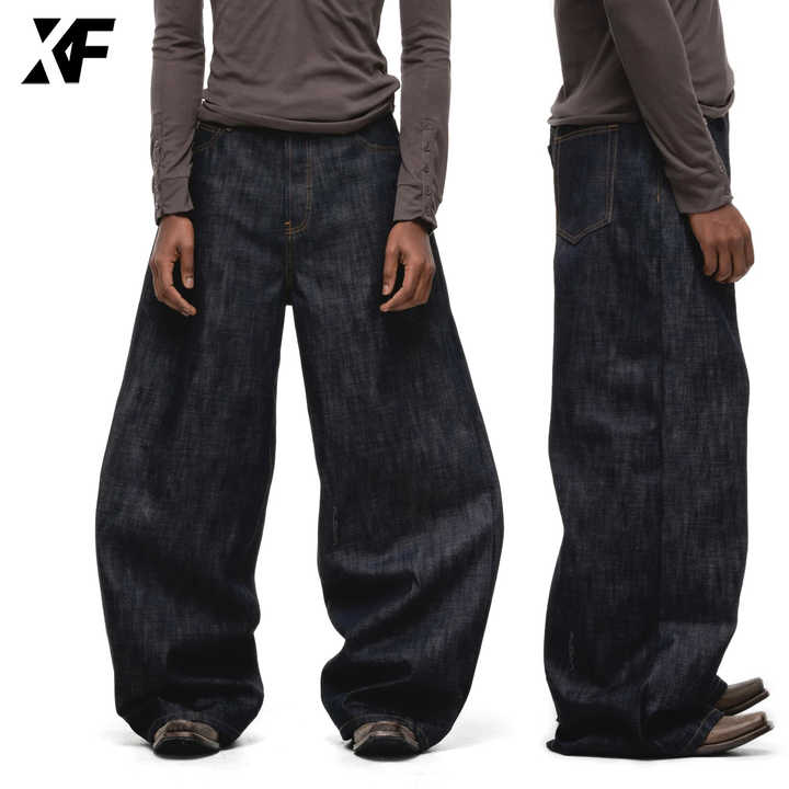 XUFEI Jeans Originali Vintage Design OEM Personalizzati da Uomo, Gamba Larga e Vestibilità Ampia, Denim Grezzo Giapponese Nero con Orlo a Saia