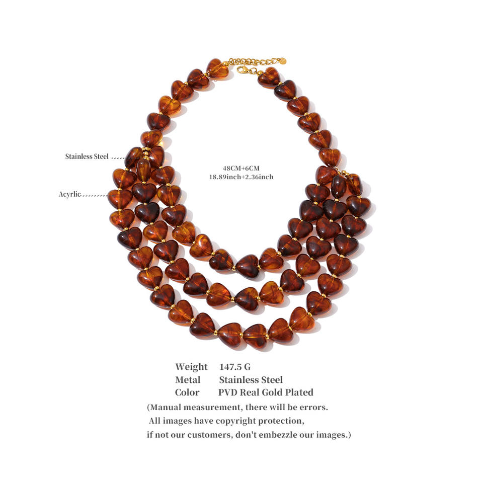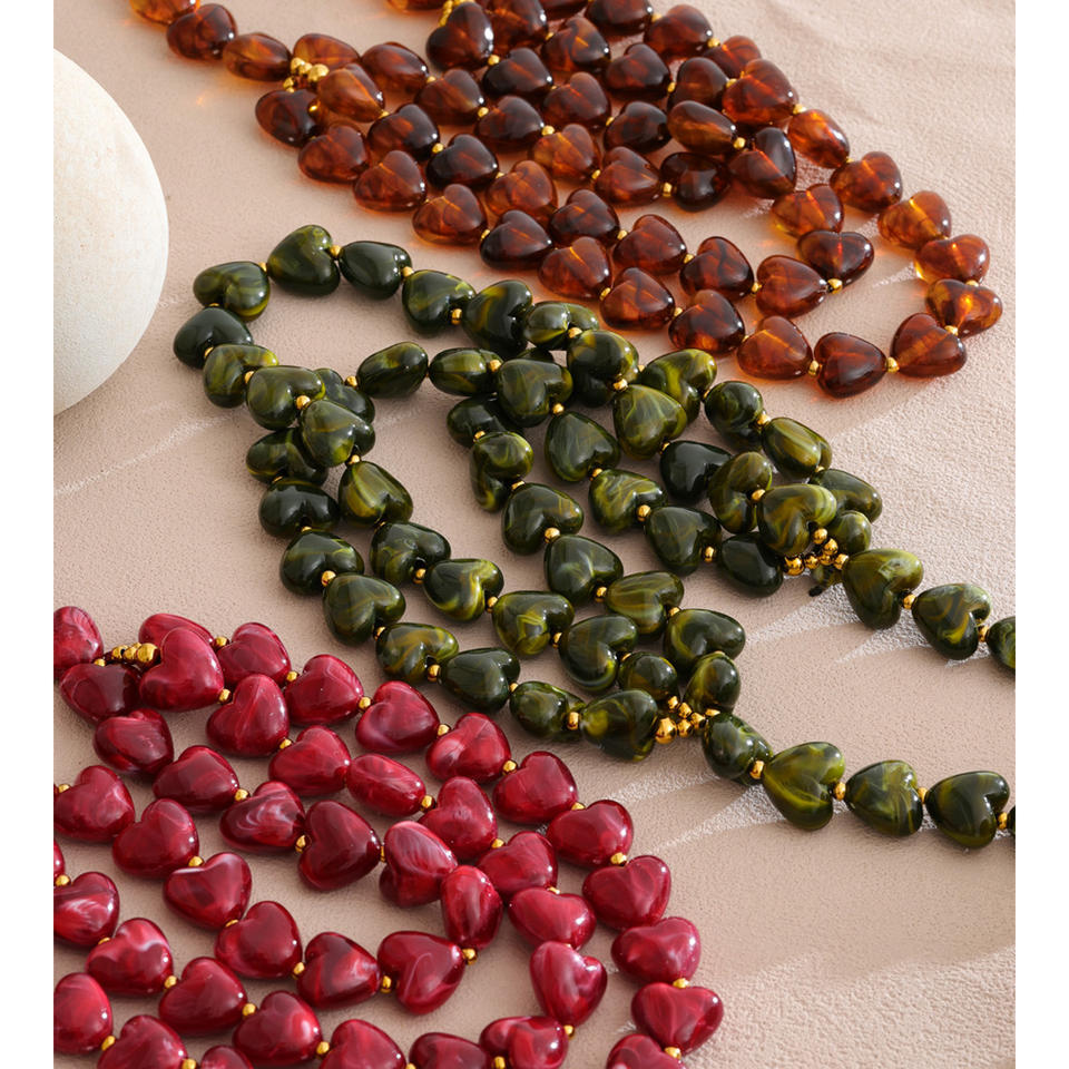 Collana Artigianale Stratificata XY 3438 Stile Autunno Inverno con Ciondolo a Cuore in Acciaio Inossidabile, Ambra Verde e Rosso Scuro, e Catena in Acrilico