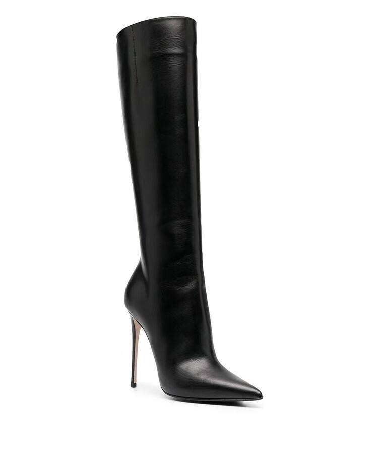 Xinzirain Wholesale Ladies Knee-High Stiletto Boots Custom Logo Pointy Toe Solid Black Leather Women's Long Boots