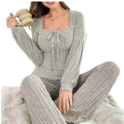 Xiyin TEMU Women's Double-Long Pajamas Hot Selling Home Clothes in Gray for Autumn & Winter Sanding Pit Strip Style