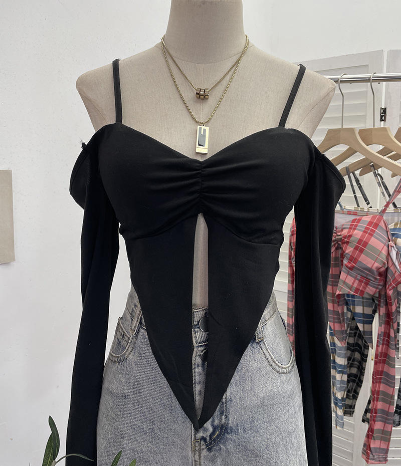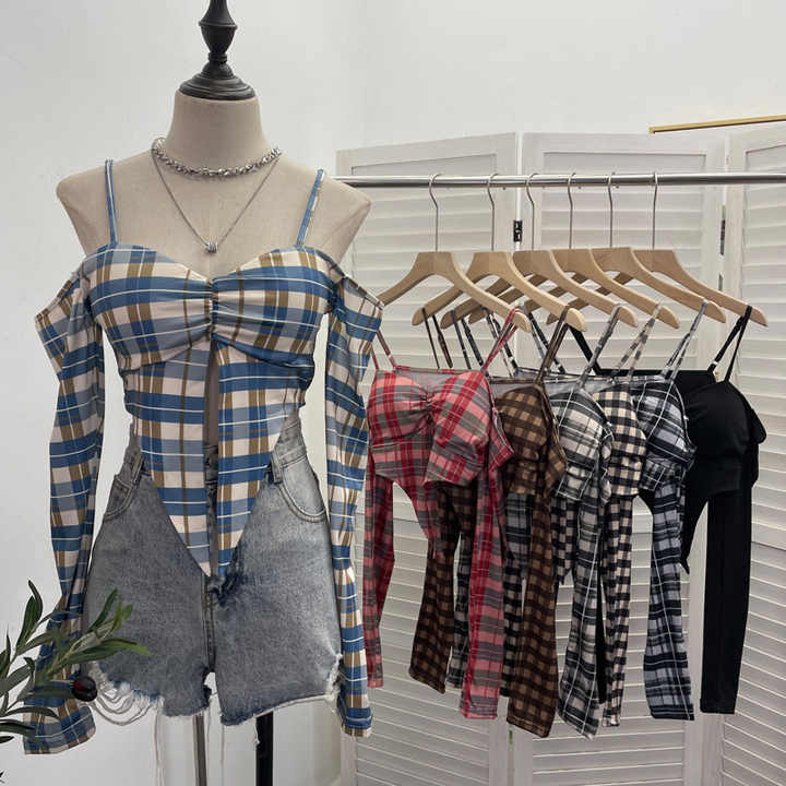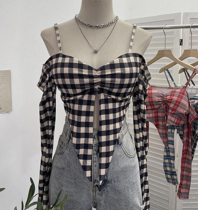 Monospalla Y2k con fascia a pieghe e petto imbottito, camicia a quadri