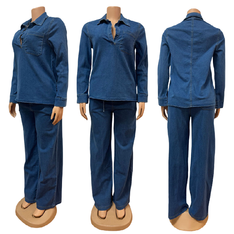 Y6561 Denim Suit for Women Long Sleeve Lapel Pocket Top + Lace up Straight Jeans Set Outfits for Women Denim Set for Ladies