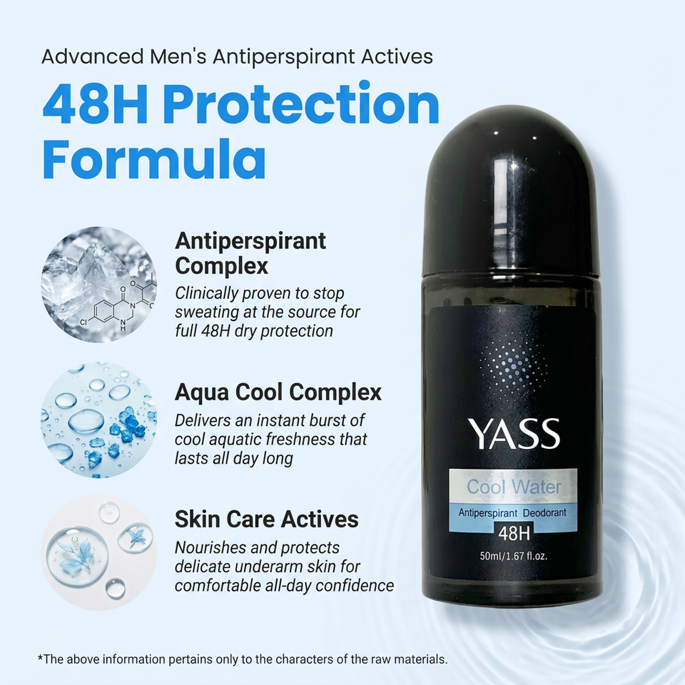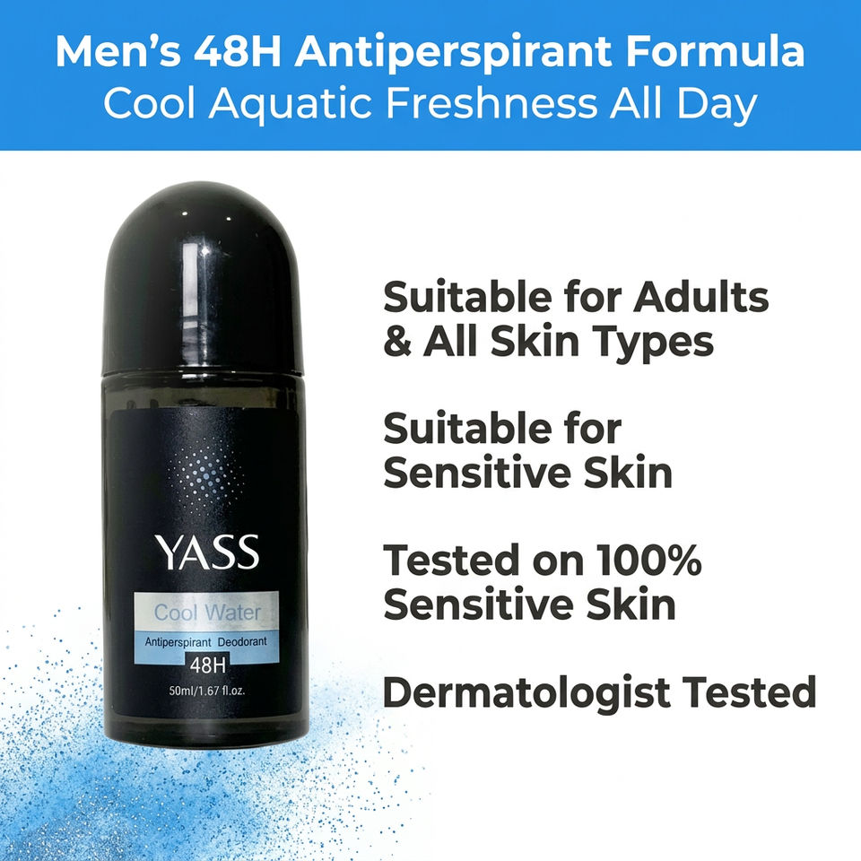 YASS Deodorante Roll-on Cool Water per Uomo, Antitraspirante 50ml, Protezione 48H, Freschezza Acquatica, per Pelle Sensibile