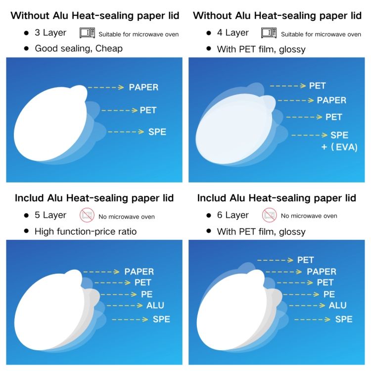 Coperchi in Carta-Plastica Termosaldabili YBLPAK, Grado Alimentare, Non Tossici, Richiudibili, Antimanomissione, Ecologici, Riciclabili, Chiusure per Imballaggi