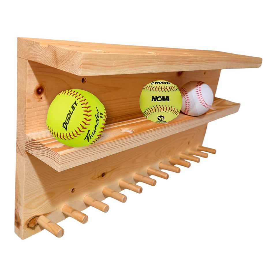 YEEYAYA Rastrelliera da Parete per Softball/Baseball Fatta a Mano da 24 Pollici, 3 Ripiani con 11 Supporti per Mazze e 12 per Palline, per Esposizione Trofei