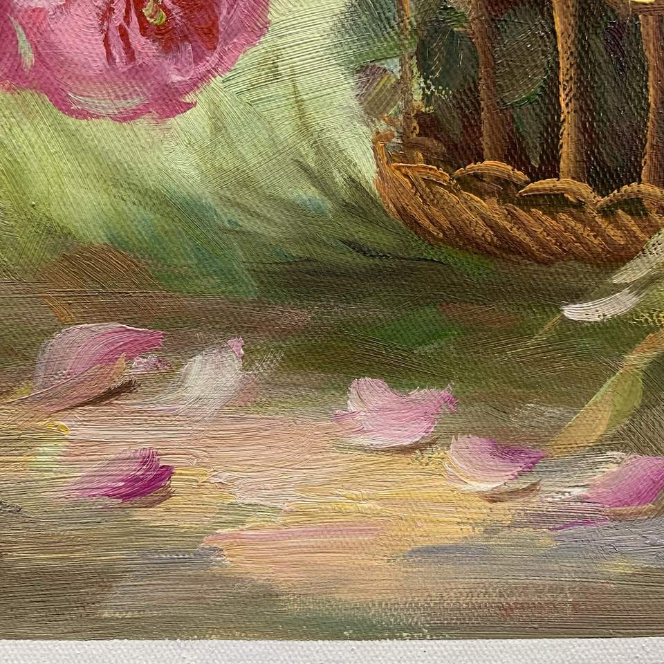 YEEYAYA Unbranded Hand-Painted 100% Oil Paintings Pink White Flowers in Bamboo Basket 24×20in