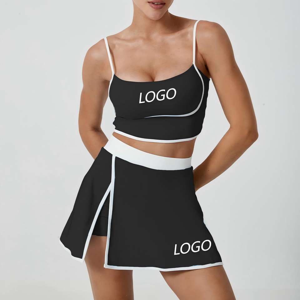 YIYI Deep U-neck Sexy strisce regolabili reggiseno da donna Set Yoga gonna corta con spacco 2 in1 Leggings con tasche per ragazze Set sportivo