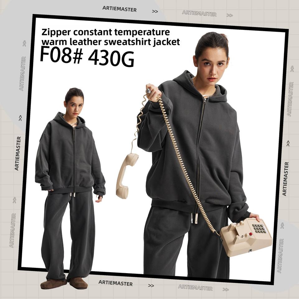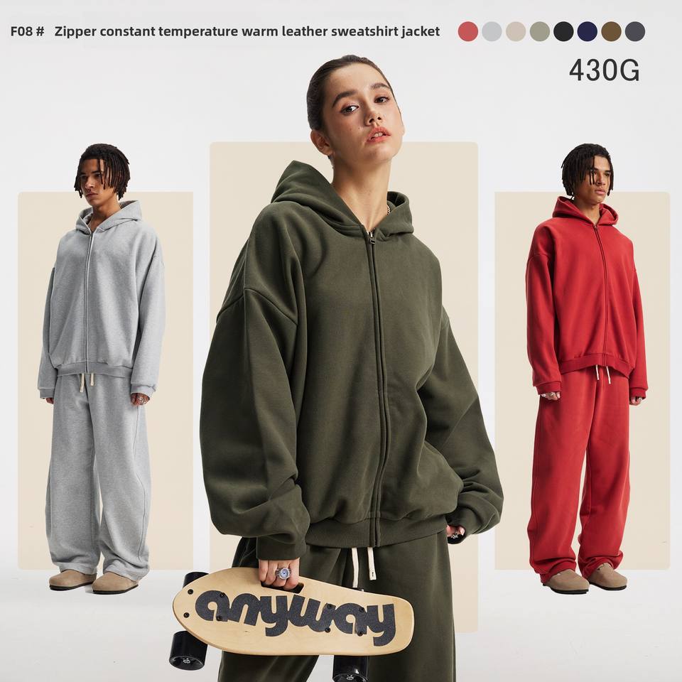 YKK Zipper 430g Fleece-Lined Constant Warm Leather Hooded Sweatshirt Loose Knitted Reversible Fur Hoodie Solid Pattern Autumn