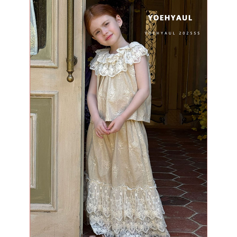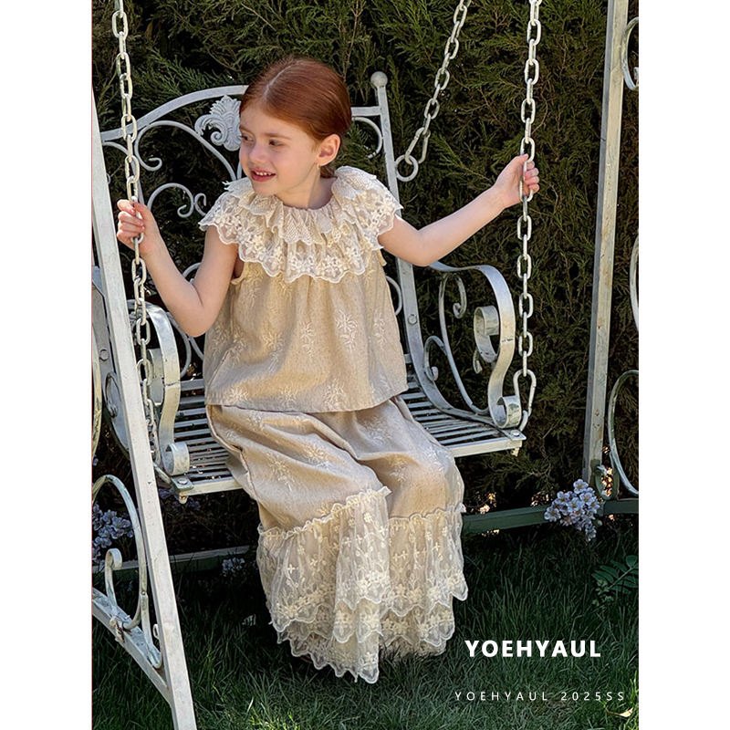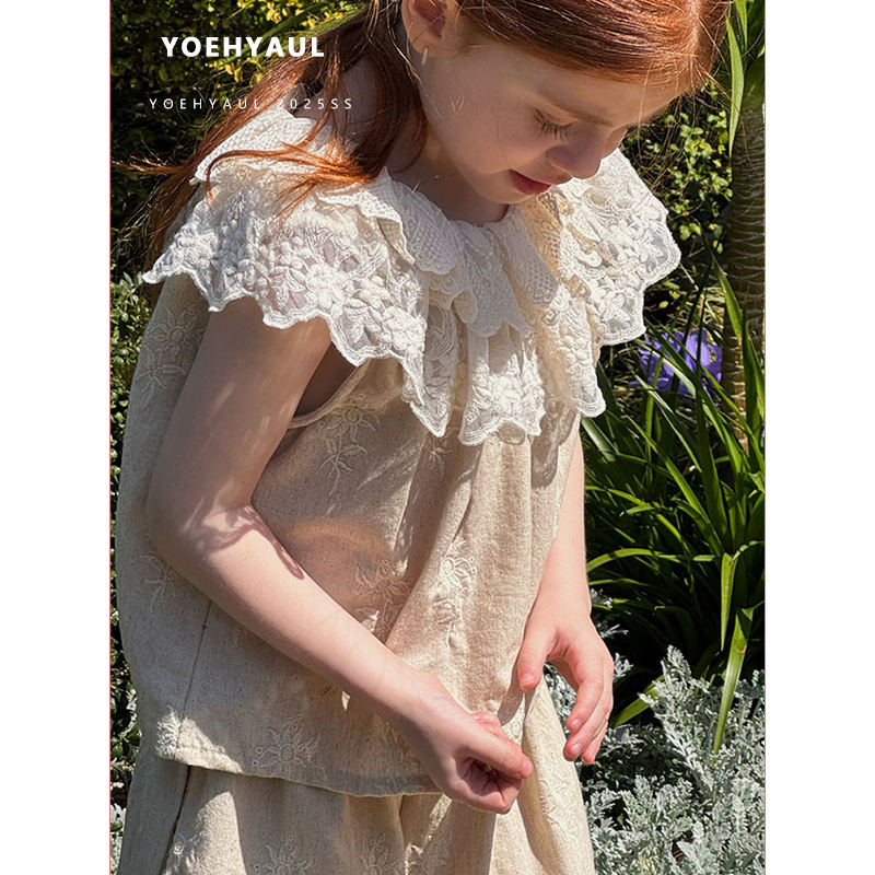 YOEHYAUL 25102 estate ragazze senza maniche con collo arruffato pantaloni larghi in lino Set t-shirt in pizzo ricamato pantaloni di pizzo per bambini