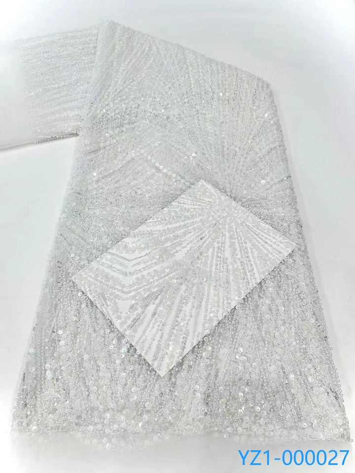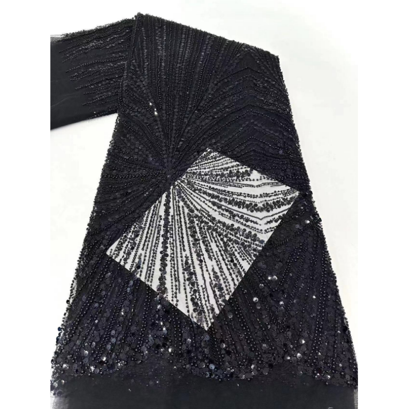Tessuto in Pizzo Nero di Lusso YZ con Paillettes Ricamate, Tessuto in Rete Glitterato, Pizzo Africano Ricamato con Perline per Abiti