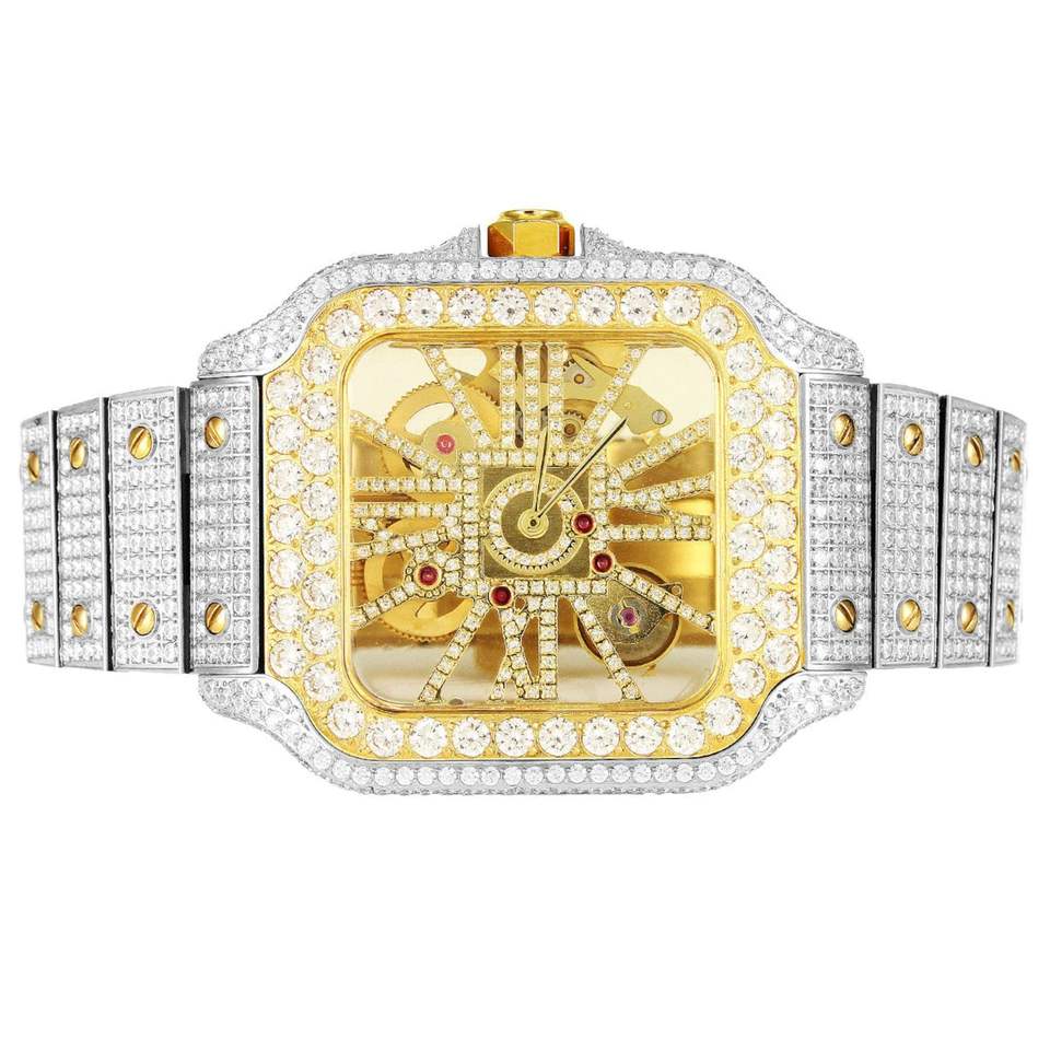 Yellow Gold Tone Full Iced Out Round Cut Diamond Skull Watch, Luxurious Bling Watch, Skelton Wrist Watch for Men