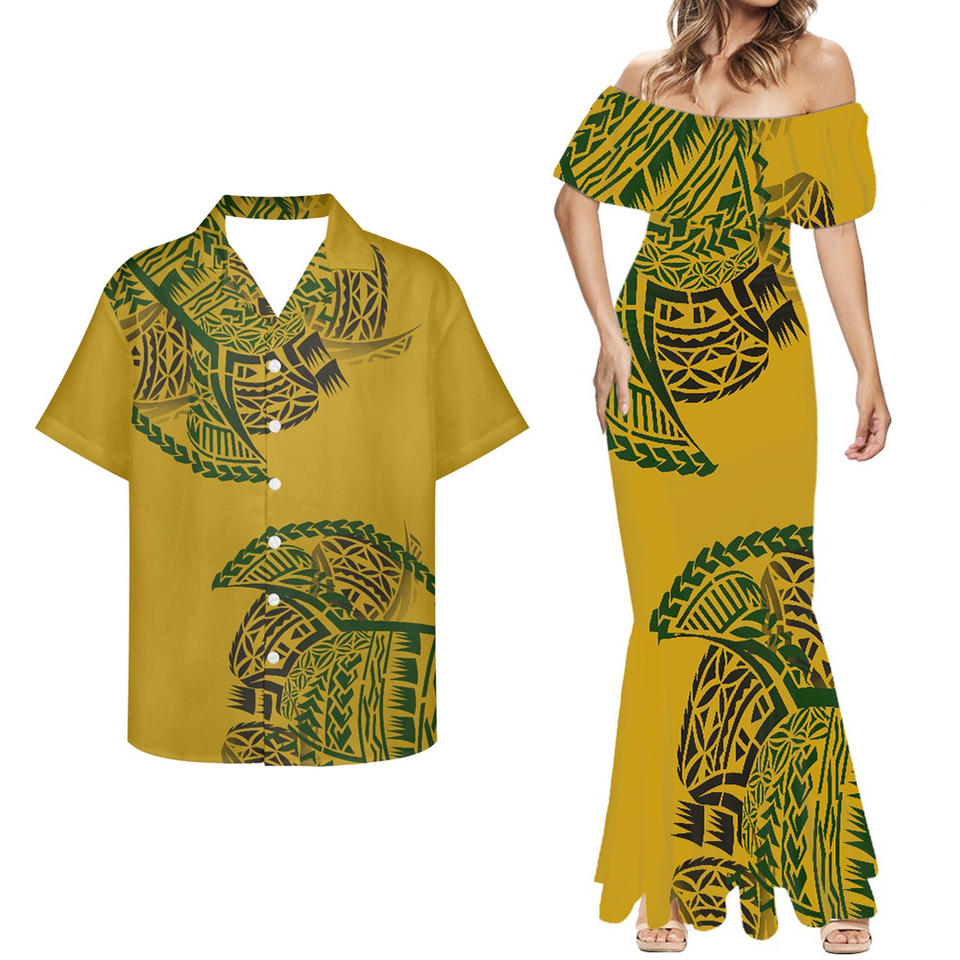 Modello tribale polinesiano giallo Plus Size abbigliamento donna 7XL personalizzato samoano Fiji coppia vestiti 2 pezzi camicia da uomo e abito a sirena