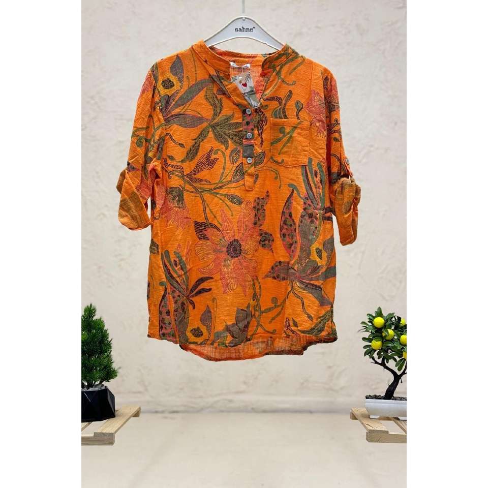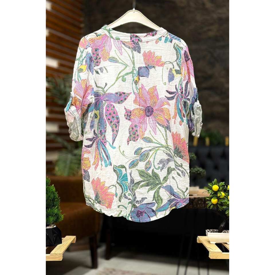 Yeni Zambak Desen Hakim Yaka Düğmeli İthal Keten Gömlek