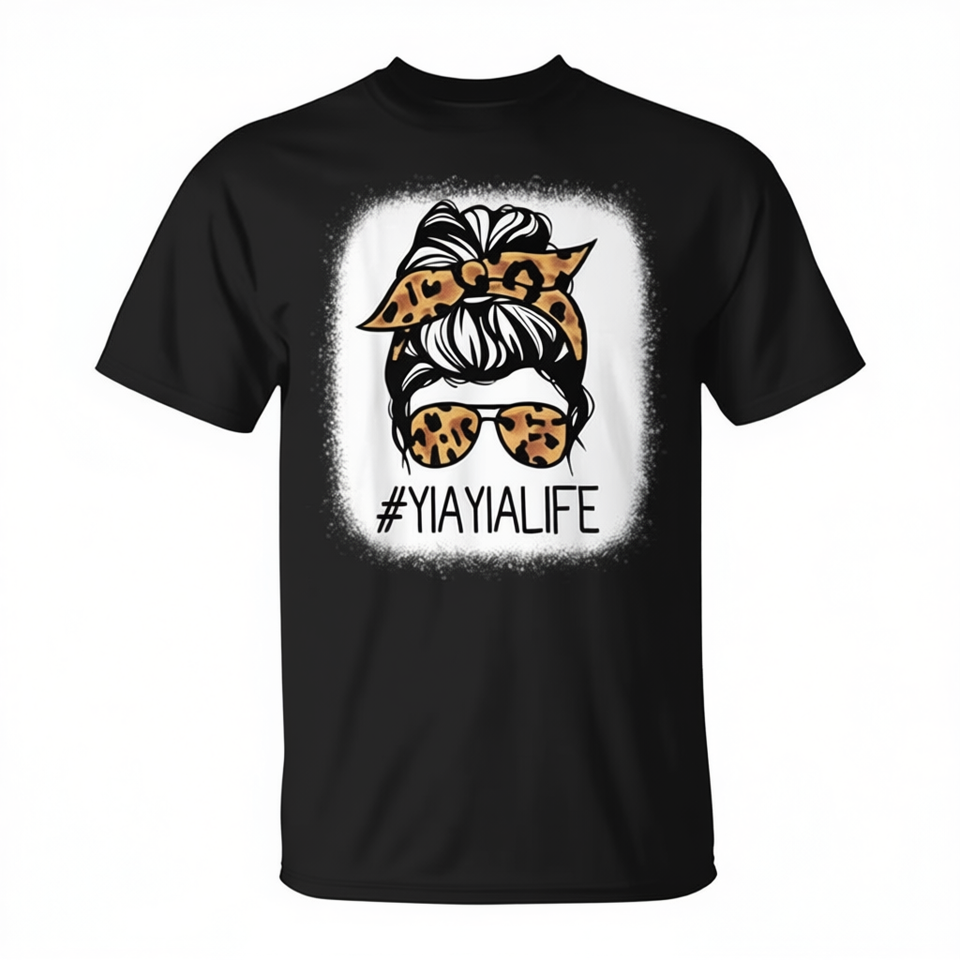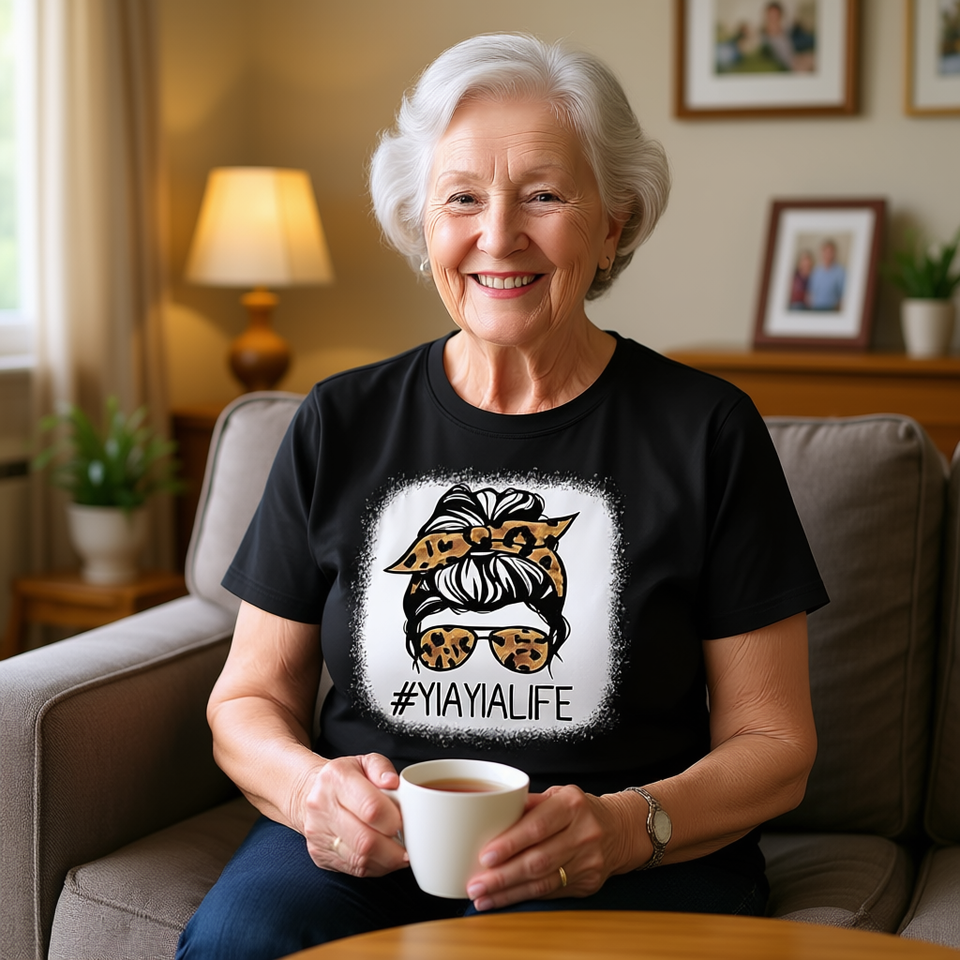 T-shirt Yiayia Leopard Messy Bun a girocollo a maniche corte con stampa digitale, regalo per la festa della mamma e per le nonne