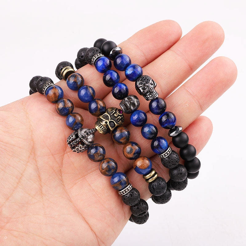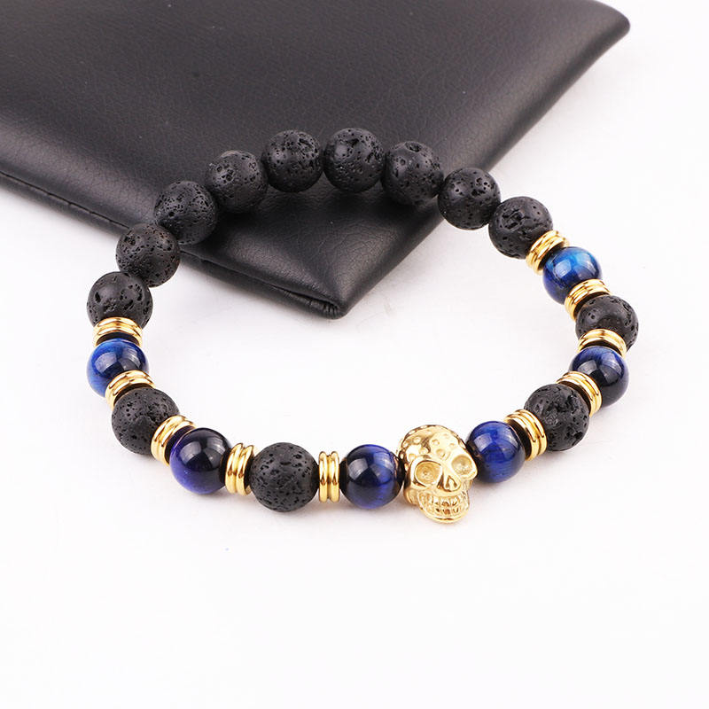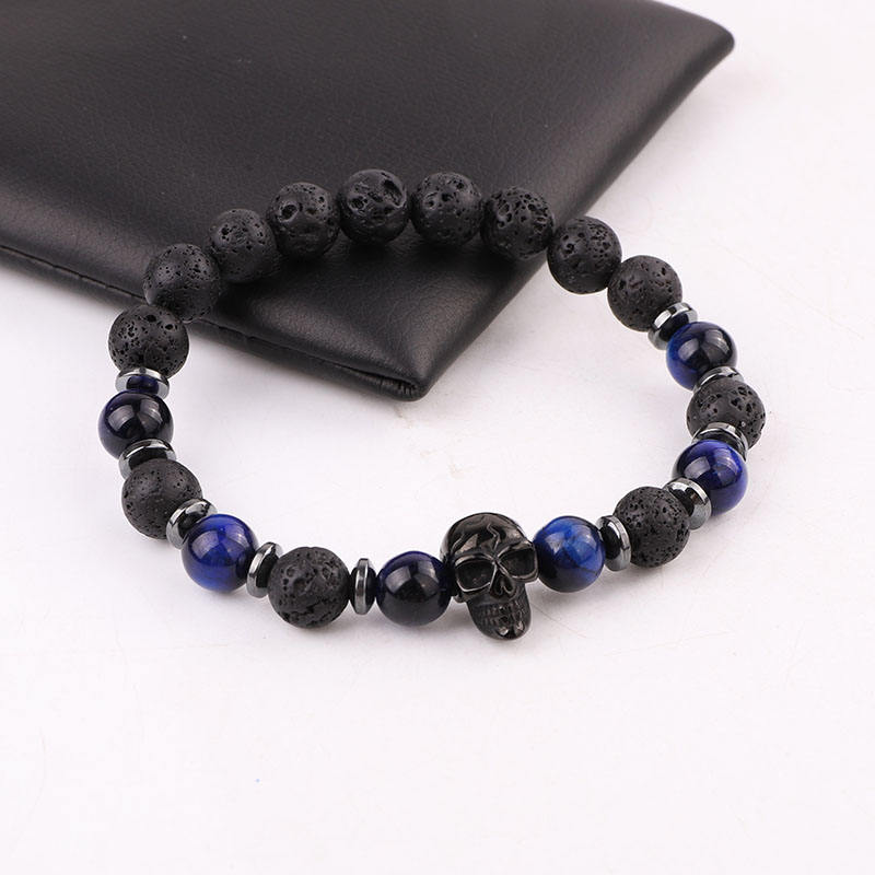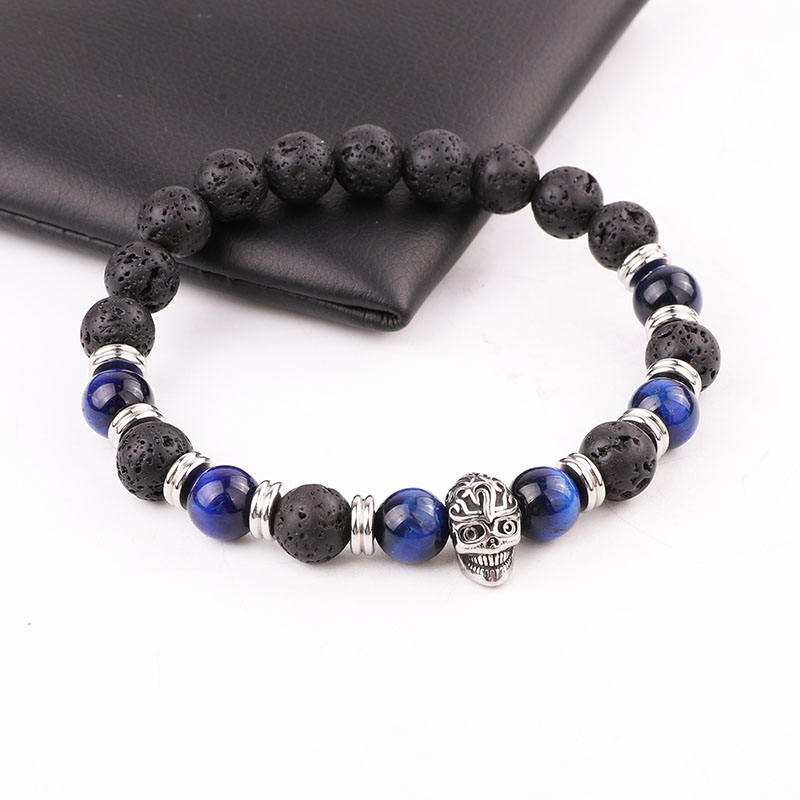 Di Yiwu Fabbrica di Gioielli Affittare Che Fanno Pietra Lavica Naturale Blu Occhio di Tigre In Rilievo In Acciaio Inox Fascino Del Cranio Braccialetto Elastico Degli Uomini