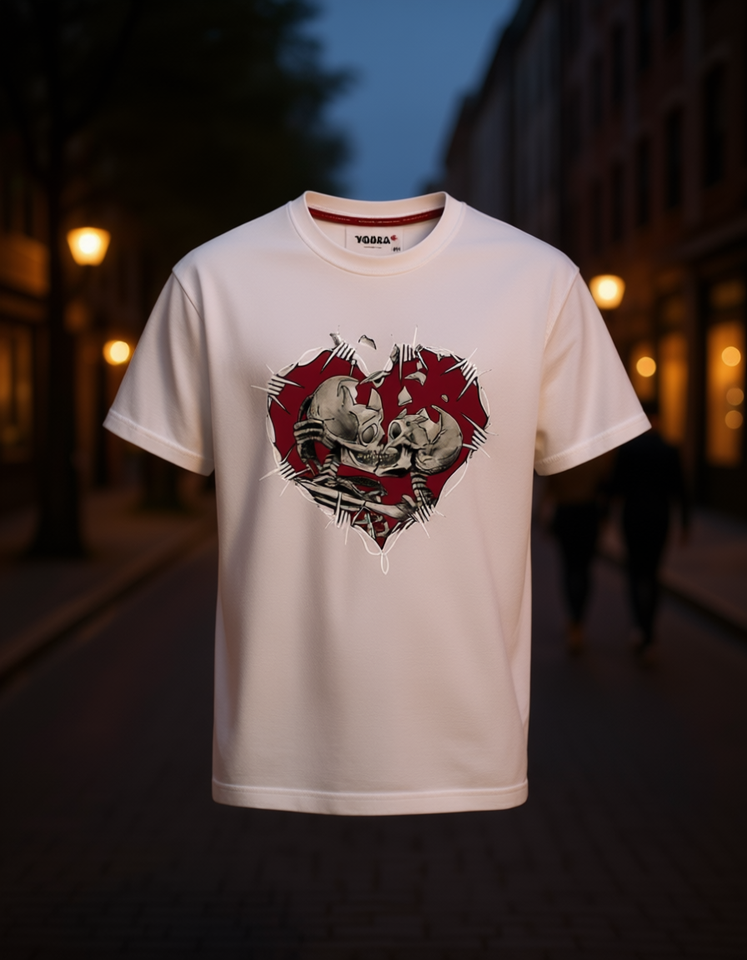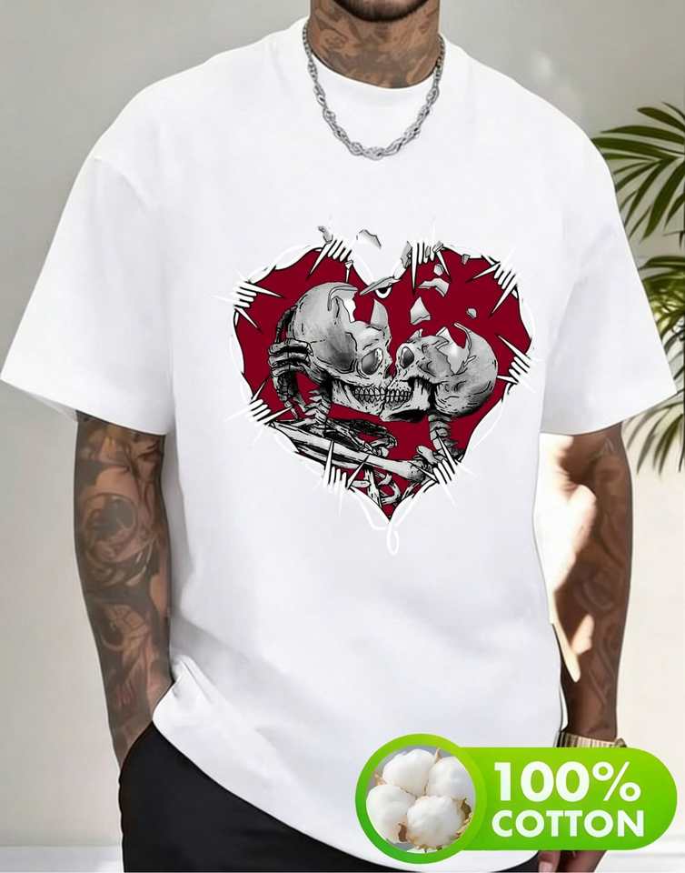 Yobra Unisex Printed T-Shirt Heart Skull Kiss Design Cotton Short Sleeve Casual O-Neck Regular Fit S-XXXXL