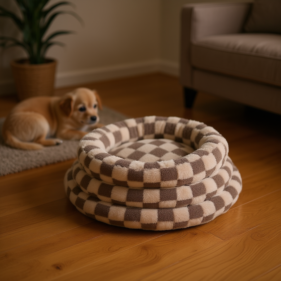 Yommy Classic Faux Fur Round Checkered Dog Bed Cradle Waterproof Anti-Slip Removable & Washable Sizes S/M/L