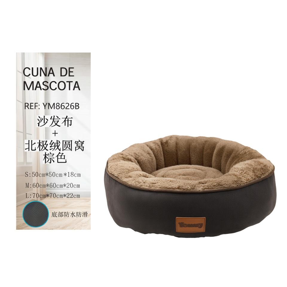 Yommy Pet Bed Sofa Fabric Arctic Fleece Round Nest Brown S M L Waterproof Non-Slip Bottom