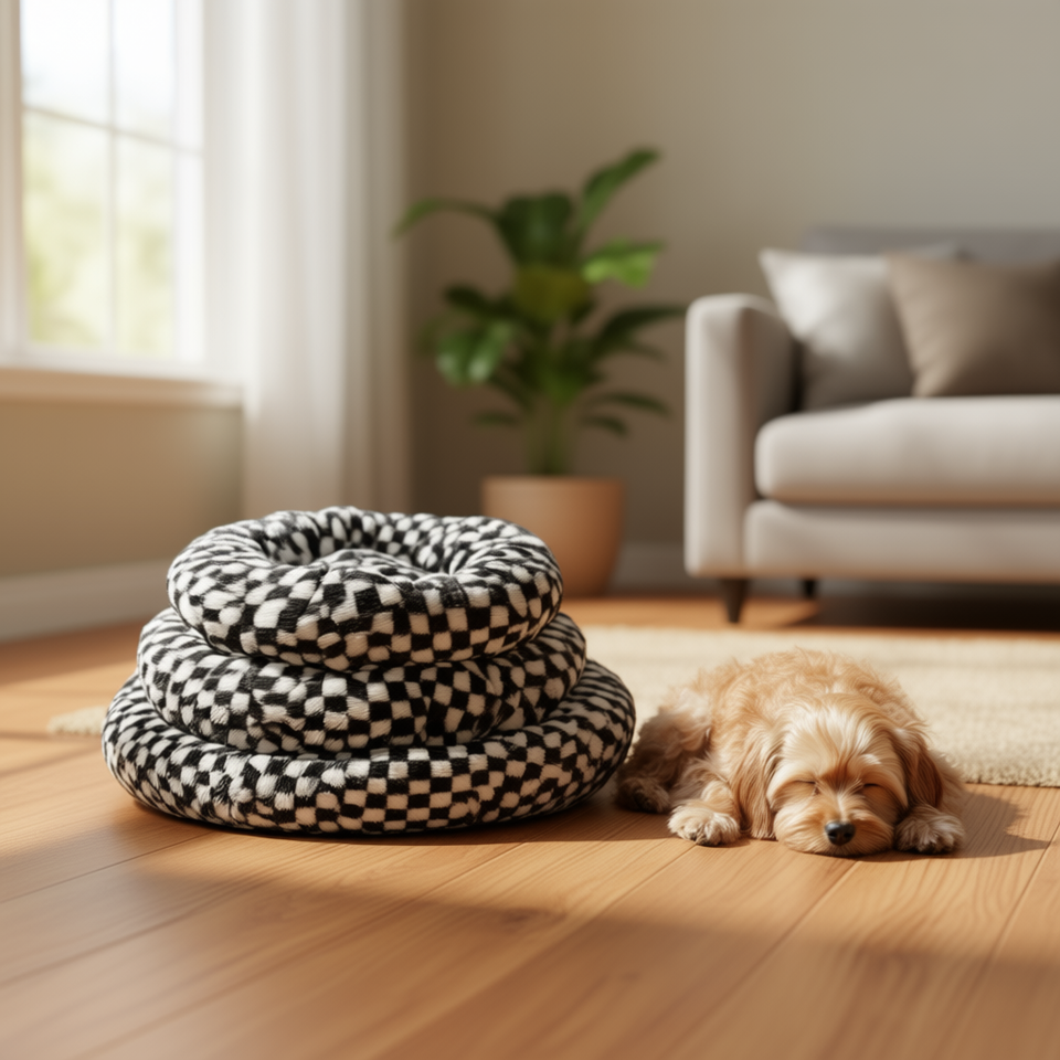 Yommy Pet Dog Bed Round Plush Checkered Pattern S M L Size Waterproof Non Slip Bottom