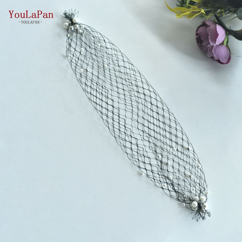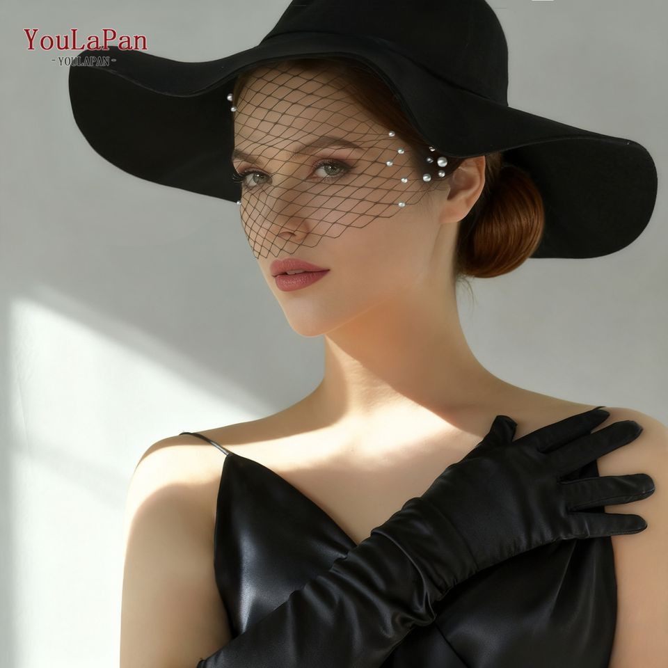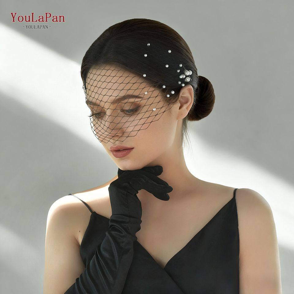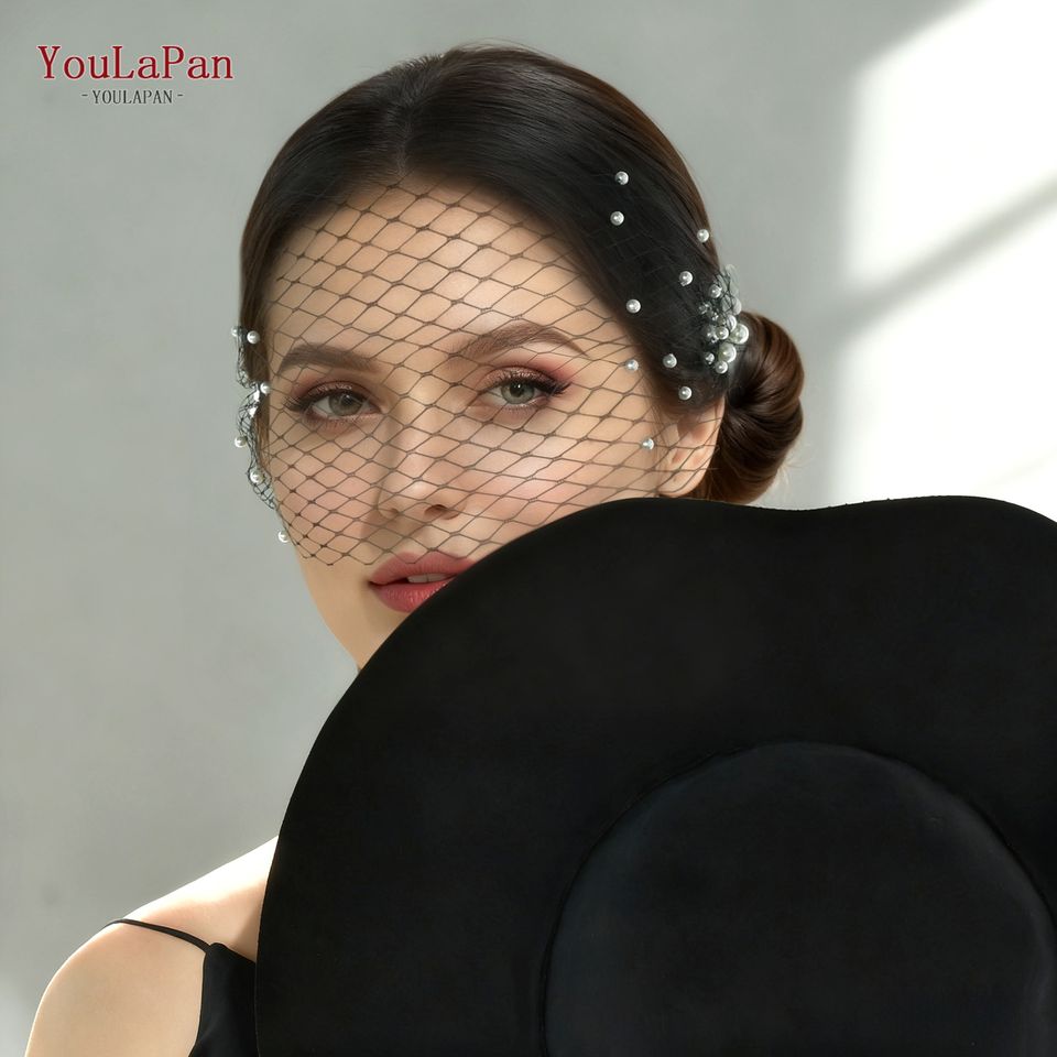YouLaPan MA08-B Velo Nuziale Minimalista Monostrato Nero Sexy a Gabbietta con Perle Oversize in Rete, Ideale per Spose