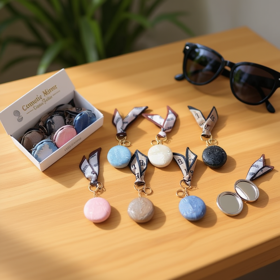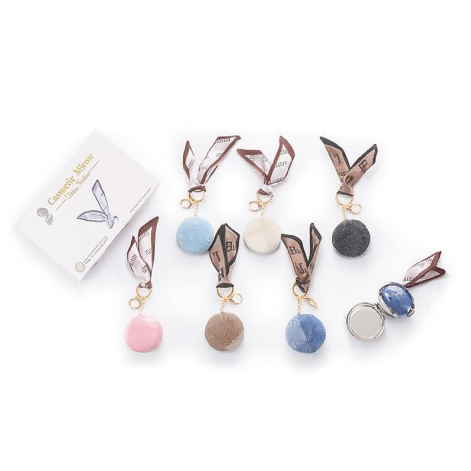 Specchietto Cosmetico Z 7,3 cm con Portachiavi in Denim a Quadri e Foulard in Seta, Specchio Tascabile, Accessorio Moda Donna