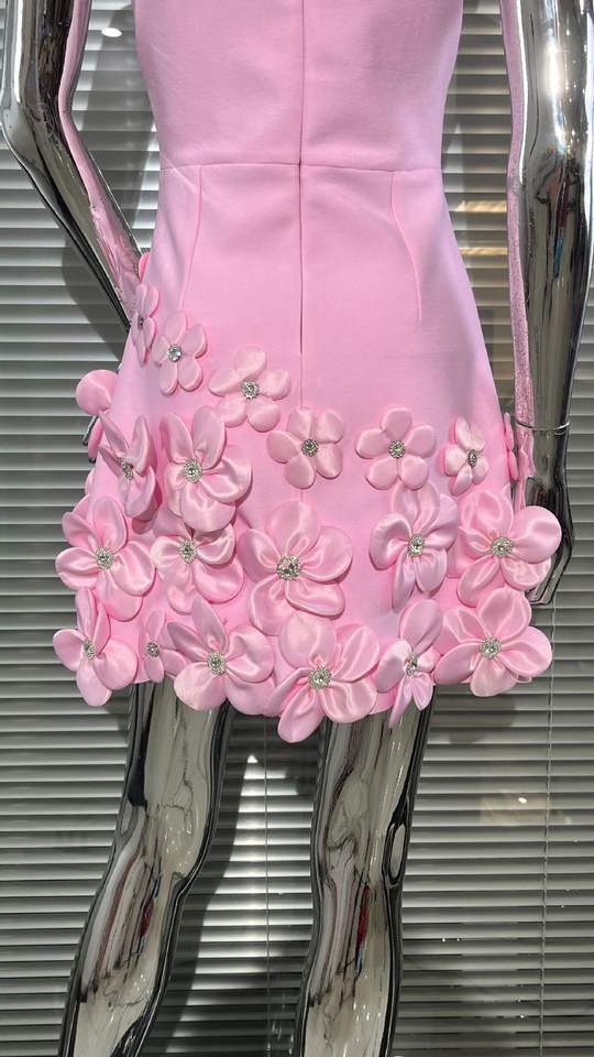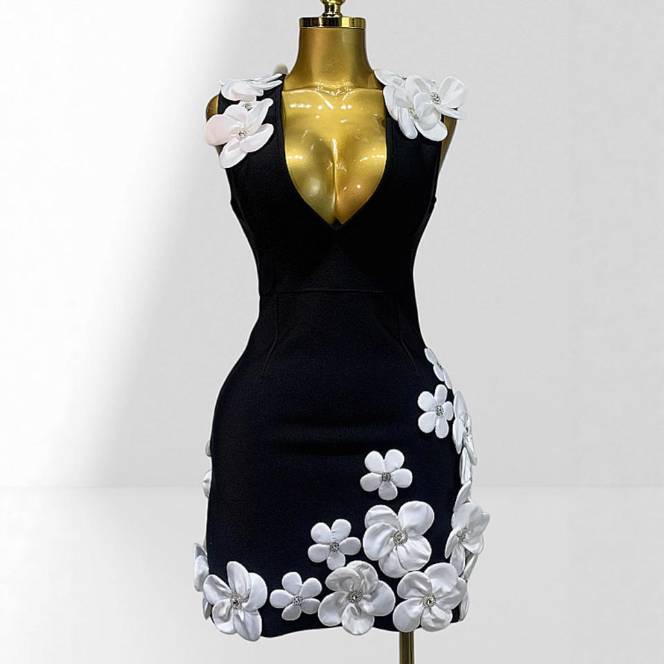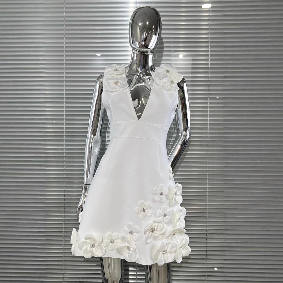 ZHEZHE Abito Corto a Linea A con Fiori Tridimensionali, Scollo a V Sexy, Senza Maniche, Vita Impero, Dolce Vestito Autunnale