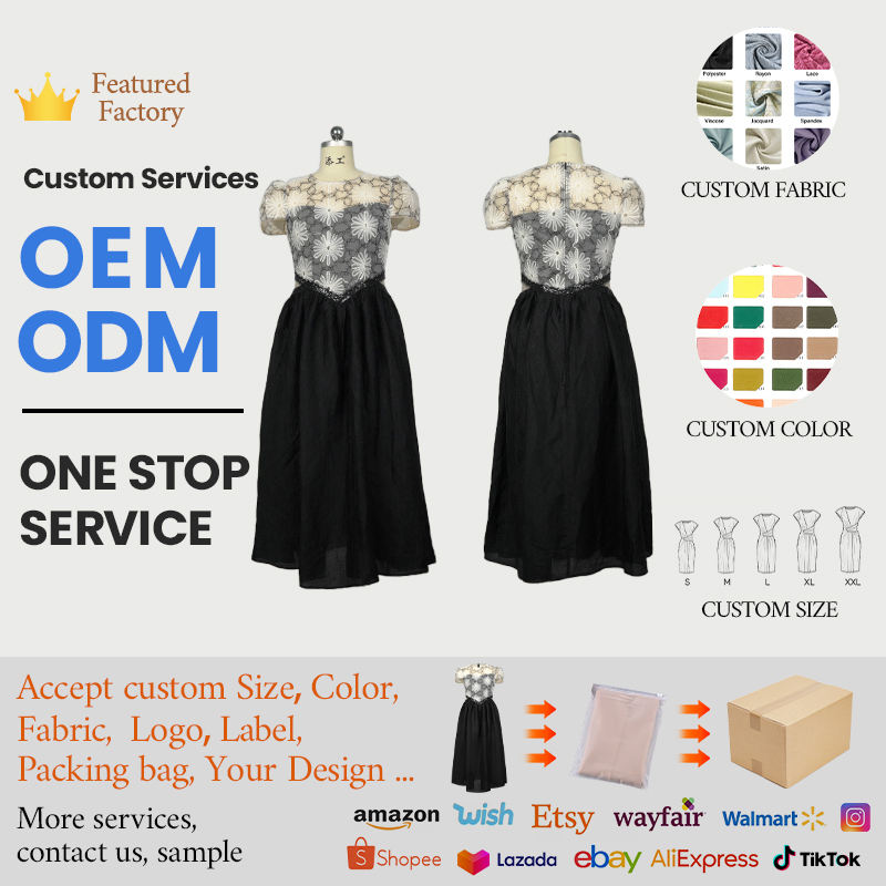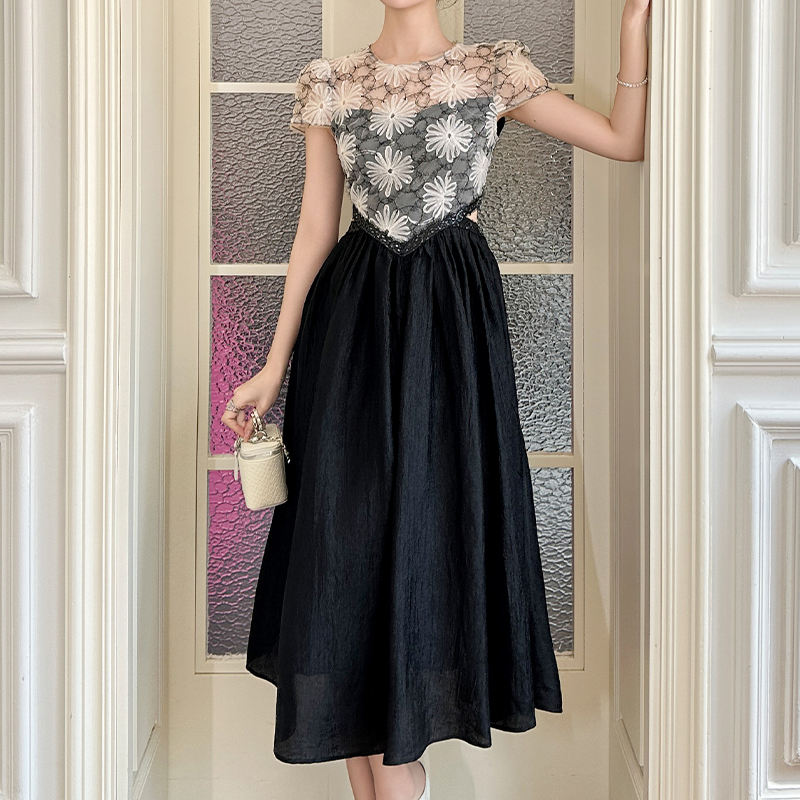 ZYHT 21765 Summer Black Midi Dress High Quality Floral Lace Patchwork French Neck Natural Waistline Woven Weave Casual Wear