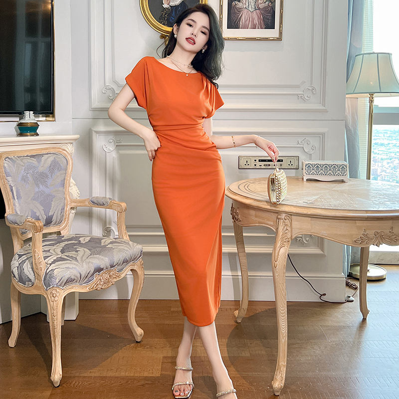 ZYHT 30526 Formal Elegant Short Sleeve Waist Ruched Knit Basic Dress Comfortable Round Neck Side Slit Body Fit Dress for Women
