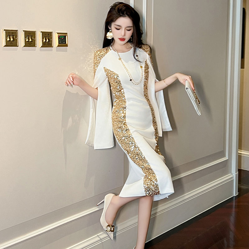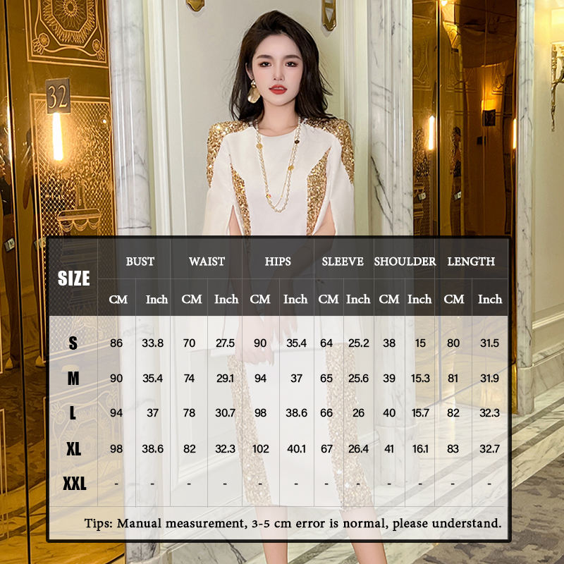 ZYHT 50495 Gold Sequins Elegant White Evening Birthday Prom Midi Dress Slit Trumpet Long Sleeve Luxury Party Gowns for Women