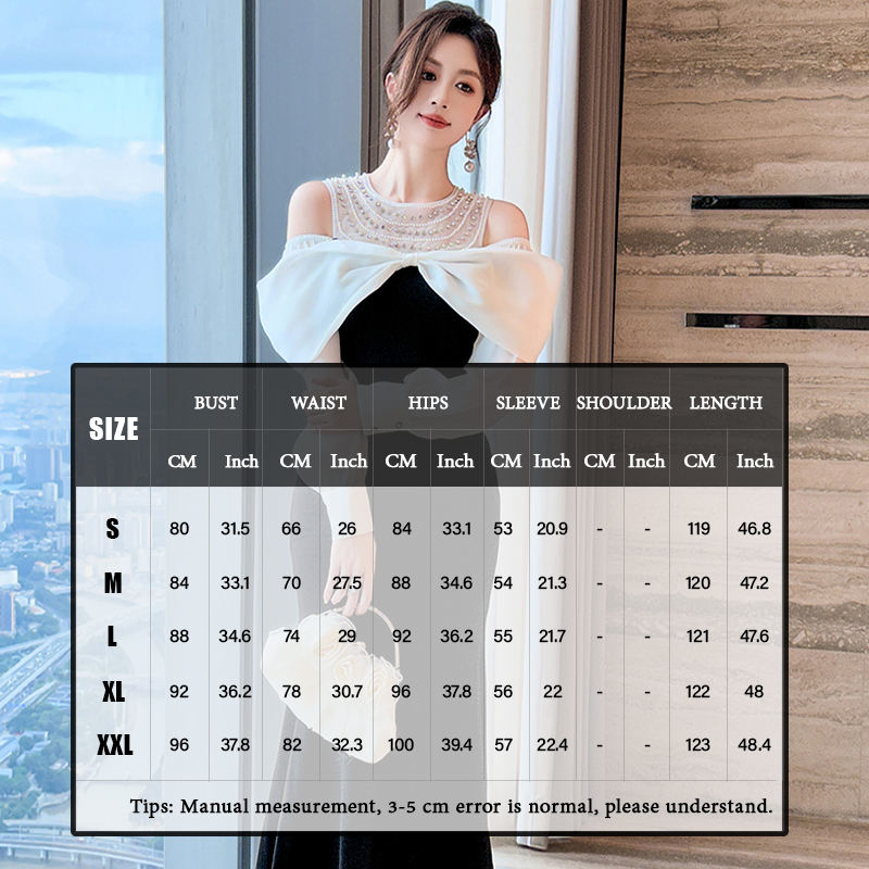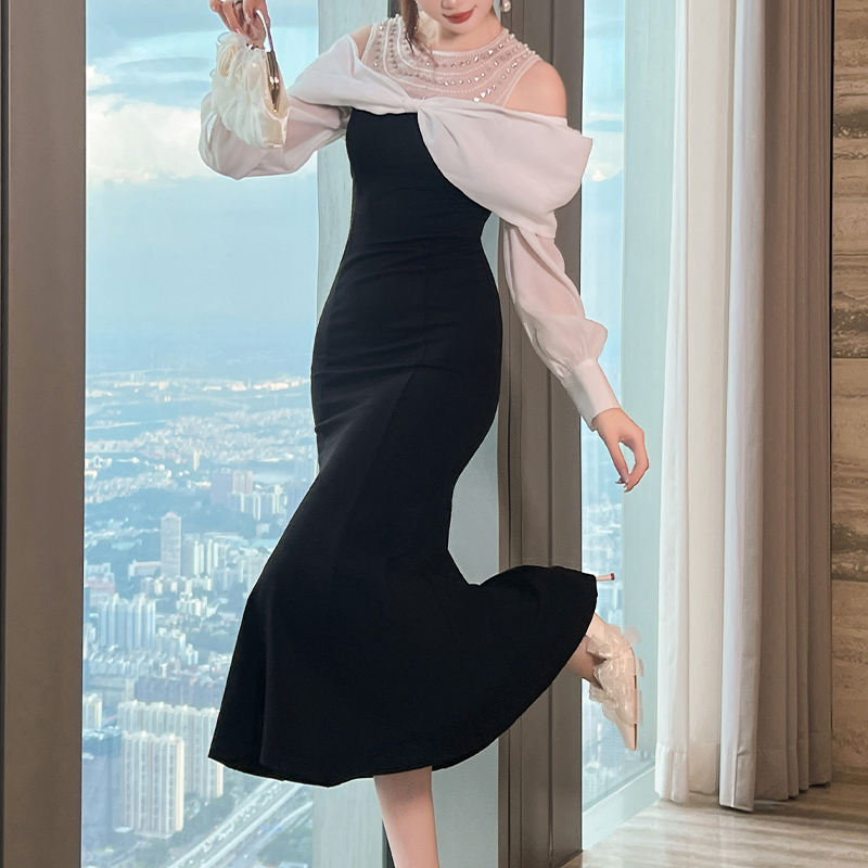 ZYHT 51100 donna manica lunga con spalle scoperte strass Party abito Midi moda coda di pesce formale eleganti abiti neri