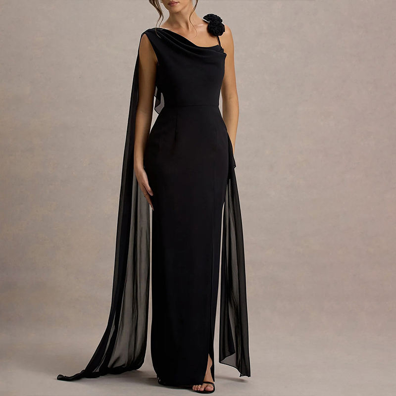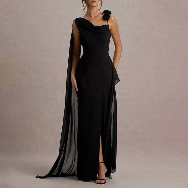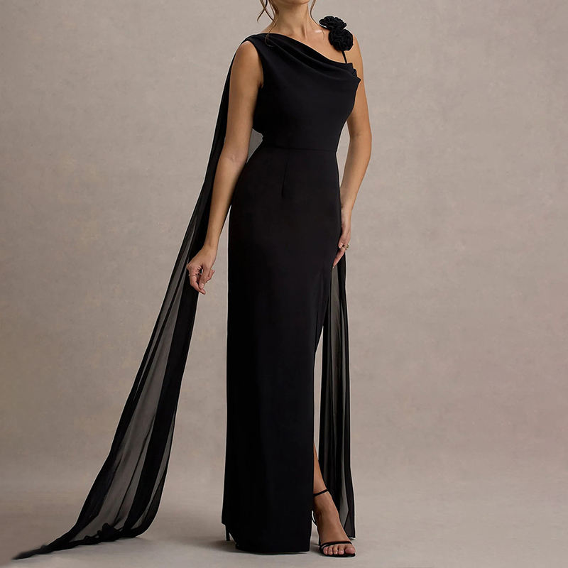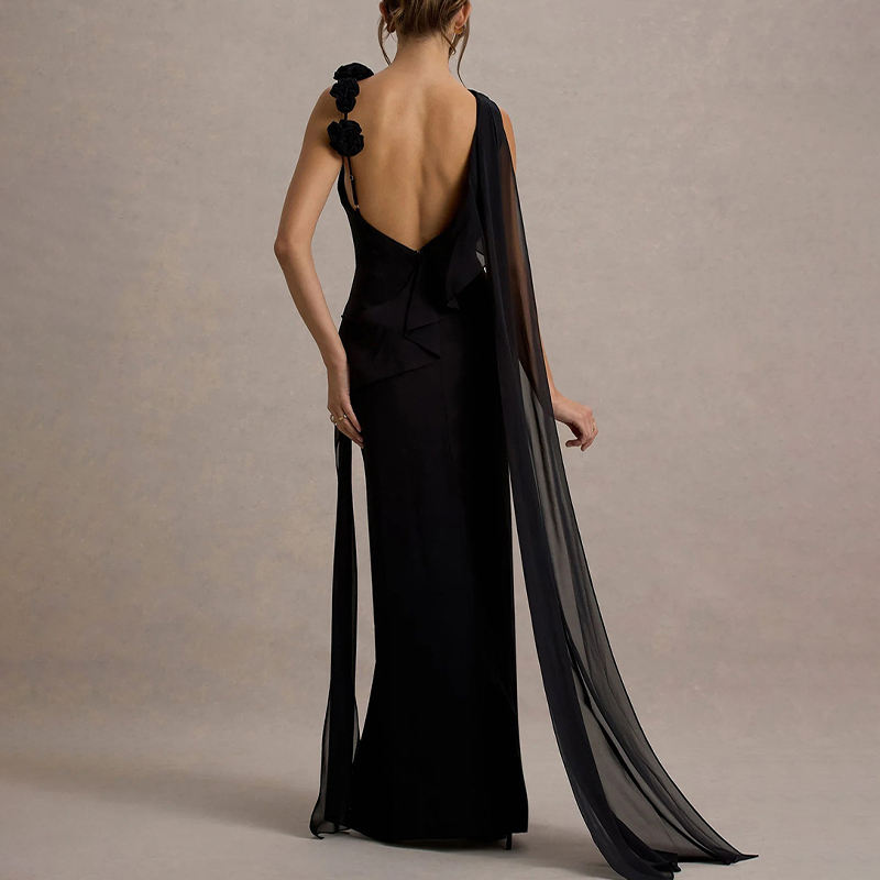 ZYHT 70118 Nuovo Elegante Abito Monospalla con Fiocco, Fiore 3D, Spacco Nero, Schiena Scoperta, Lungo in Chiffon per Feste ed Eventi Serali da Donna