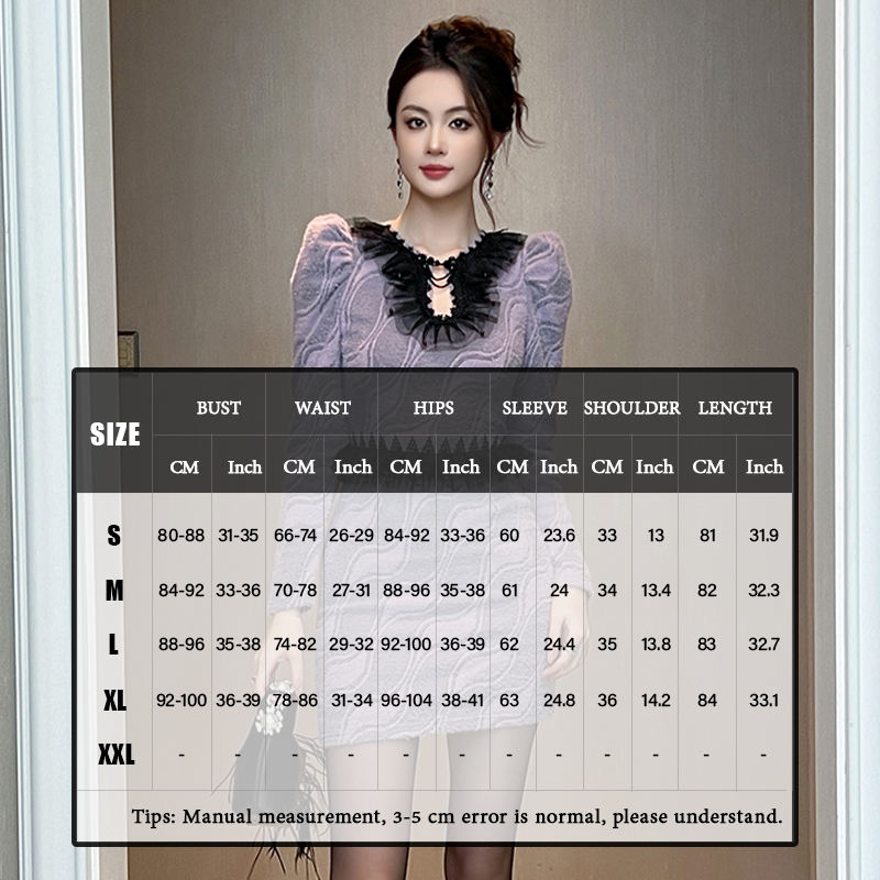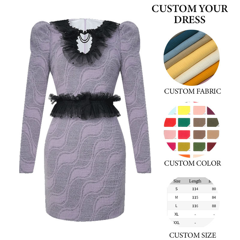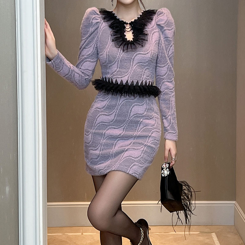 ZYHT 91377 Fashion Elegant Mini Dresses Winter French Puff Long Sleeves Waisted Purple Knitted Fur Black Lace Dress