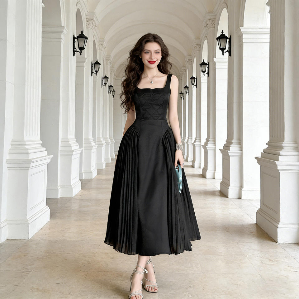 ZYHT 9831 Abito Lungo Plissettato Nero Elegante Estivo Senza Maniche in Morbido Tessuto di Lana e Lino con Schiena Scoperta