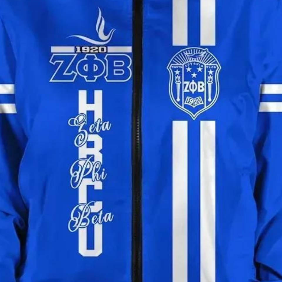 Giacca in Raso Blu e Bianca Zeta Phi Beta 1920, Abbigliamento Sorority ZPB con Ricamo a Scudo, Look Varsity Premium