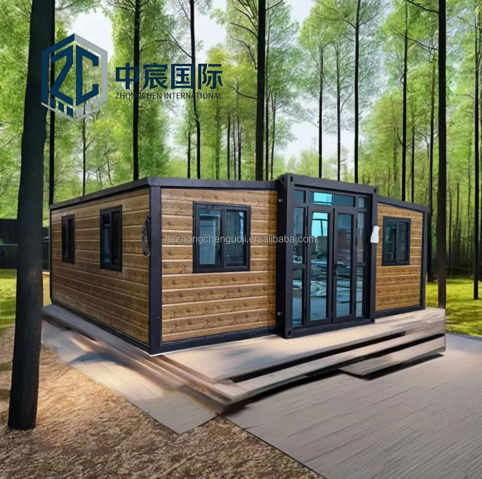 Casa Container Espandibile Zhongchen con Rivestimento Effetto Legno, Casa Modulare Prefabbricata Moderna, Spazio Abitativo Portatile per Glamping in Foresta