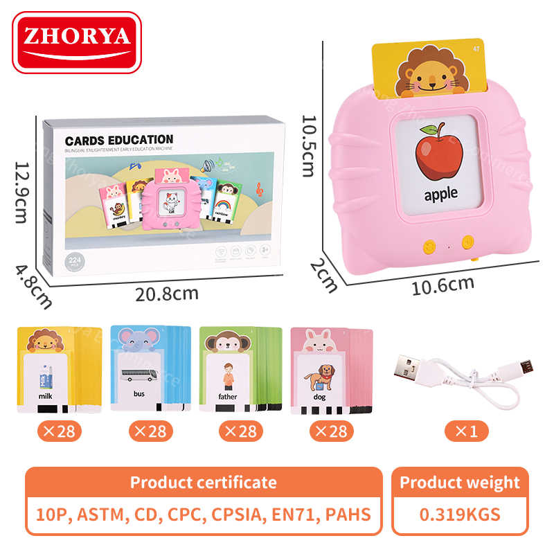 Zhorya 224pcs pink cat kids toddler educational read games talking flash card words reading learning machine