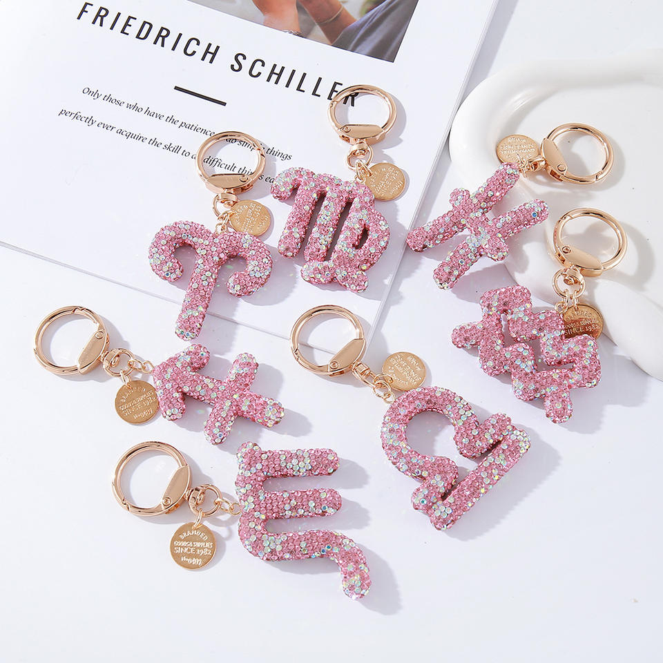 Portachiavi in Lega di Zinco con Stampa UV e Strass Rosa, 12 Segni Zodiacali, Regalo per Amiche, San Valentino, Accessori Auto, Charm per Borsa, Scuola